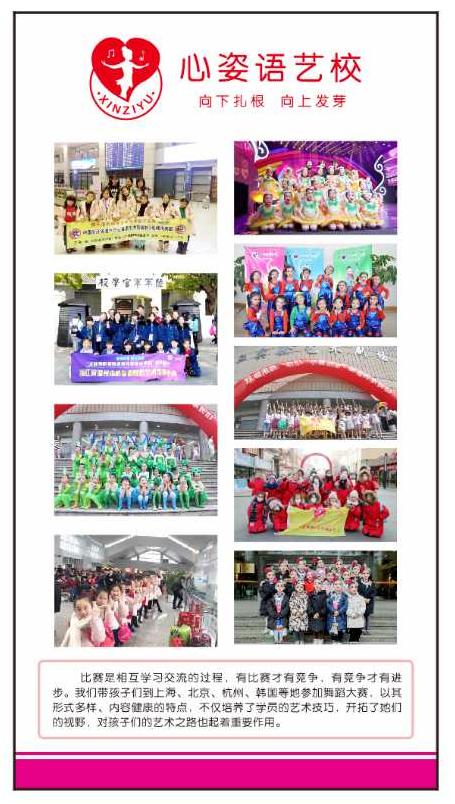 温州市心姿语舞蹈艺术培训中心是一所以快乐教育为基础,以科学性教学为先导的艺术机构。中心所有教职人员都是科班出身,师资力量严格把关。08年开办至今,得到社会各界以及家长们的一致好评。荣获“全国十佳最具影响力新锐艺术教育机构”称号,荣获“浙江省最佳人气选手培育单位”称号,荣获“文化艺术交流先进单位”称号,荣获“浙江省艺术活动优秀组织单位”称号,荣获“温州市青少年舞蹈大赛优秀组织奖”称号,荣获“北京舞蹈学院中国舞考级优秀考级单位”称号。