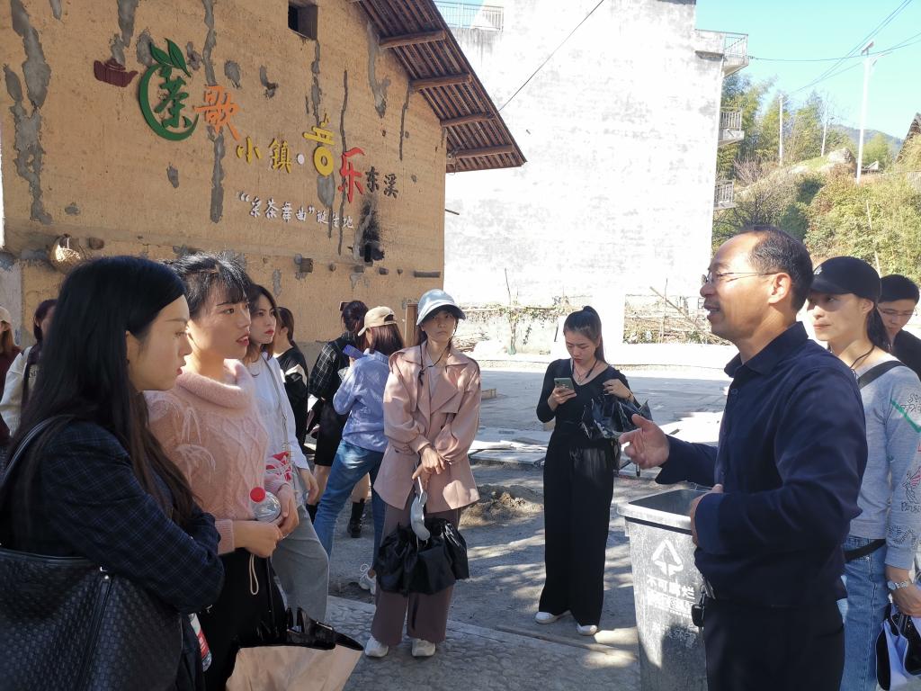 采风实践队来到了位于泰顺的东溪乡,国家一级作曲家周大风先生便是在这里采风创作,孕育出了享誉世界的《采茶舞曲》。我院师生在东溪乡蔡书记和何主任的带领下,参观了周大风《采茶舞曲》纪念馆和周大风创作旧址。我们一边欣赏着优美动听的《采茶舞曲》,一边感受着周大风先生音乐创作的魅力。泰顺东溪的音乐氛围浓厚,其在建中的东溪乡音乐小镇是《采茶舞曲》经久不衰的见证,也是当下音乐文化构建旅游产业的一个缩影。