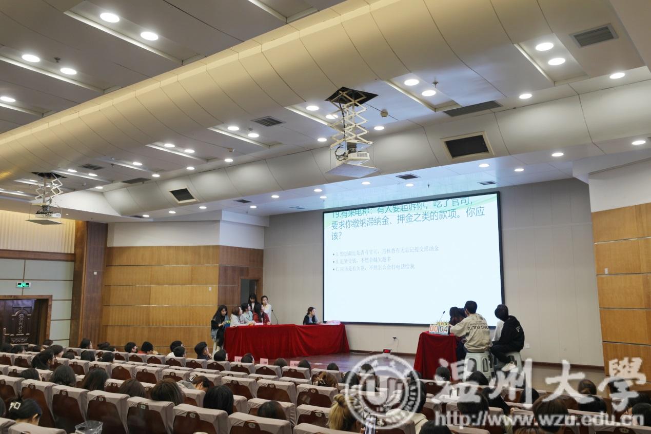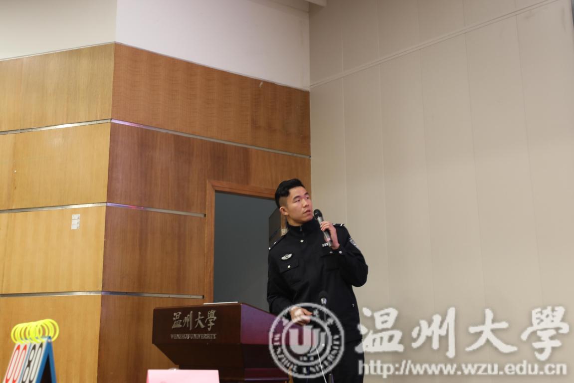 接下来进入到活动的第二部分,由茶山派出所周文涛警官为我们讲解反诈防诈安全教育宣讲。周警官为大家分享了多起发生在我们身边的真实案例,并罗列了温州几所高校受到诈骗的数据,在场同学认真观看。周警官指出,高校的受诈骗占比非常之大,这不得不让我们在耳边敲响警钟。另外,周警官还介绍了几个常见的诈骗方式,其中包括电话诈骗、校园贷、假冒公检法诈骗、考试诈骗、裸聊诈骗等,希望同学们可以擦亮眼睛,谨防陷入骗子的圈套。活动最后,周警官强调“套路千万条,防诈是一条,天上不会掉馅饼,守牢钱财最要紧”,望大家引以为戒。