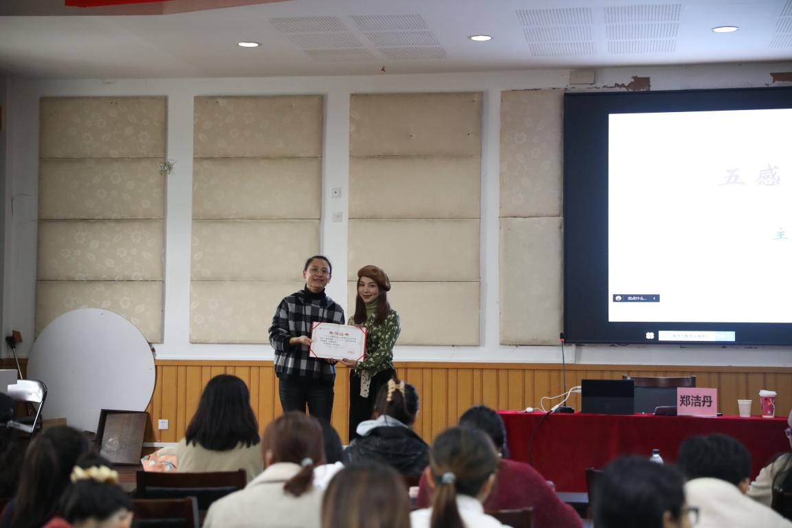郑洁丹老师认为对于艺术学科的自我定位是面向全体学生,以美育人,融合各学科为学习之本,提升本专业为发展之道,指向核心素养为育人之重;学科间相辅相成,兼顾德智体美劳全面发展的五育融合学科。接着郑老师讲到的“五感”指的是仪式感、敬畏感、成就感、责任感和幸福感。她指出,仪式感是指学习、工作应是静待、致敬的态度。敬畏感体现在课堂艺术上,如聆听需要尊重作品,专注课堂;静阅需要理解作品,品鉴欣赏;乐享则需要表达所感,分享所获。最后郑洁丹老师通过观看视频、图片的形式分享了她的一些宝贵经历,让同学们更好的理解如何做好一名教师。