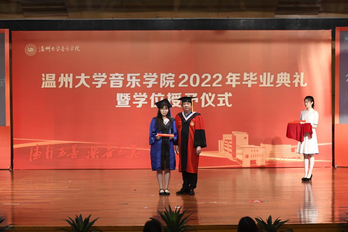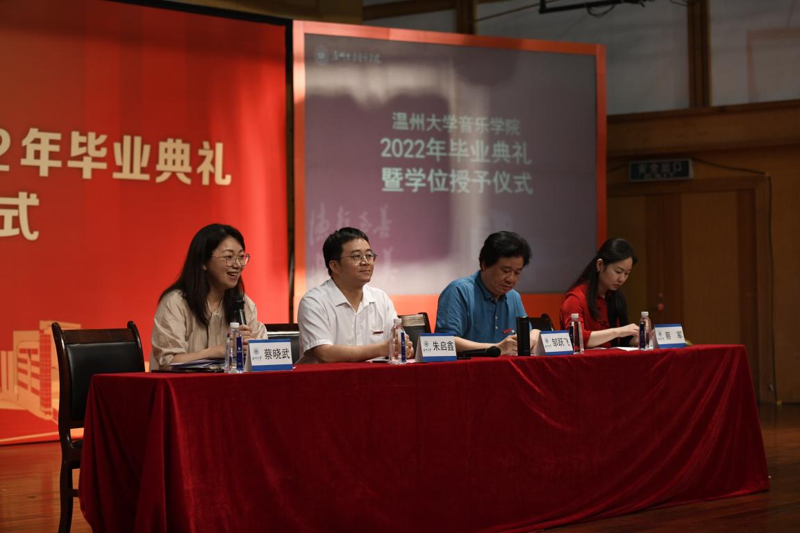 “这是离别的季节,也是收获的季节。”院长邹跃飞教授在讲话中提到,“几年前,同学们凭借着优异成绩,带着对音乐的梦想,考入温大。几年来,生活在浙南闽北赣东地区唯一一所综合性的教学研究型大学,沉浸在多学科教育生态环境里,陶醉在音乐艺术的氛围中。在这美好的大学时光里,同学们寒来暑往,勤学不辍,以坚韧的毅力和优异的成绩完成了学业。"他强调“过去的几年间同学们在省内外各大赛事和各类舞台上成绩斐然,省级、国家级大艺展、歌剧《五星红旗》、温大庆祝建党百年大型交响合唱音乐会等各类高规格的舞台上都曾留下同学们艰辛的汗水和精湛的技艺。”最后,他深深的祝福同学们“无论干哪一行,也无论站在哪个舞台上,都要有着“温大人”这个共同的称谓,无论走得多远,都是母校永远的牵挂,走出校门后,常回家看看,相信未来一定能听到毕业生频传的喜讯,那时母校将为每个人感到无比骄傲和荣光!”