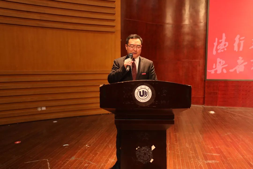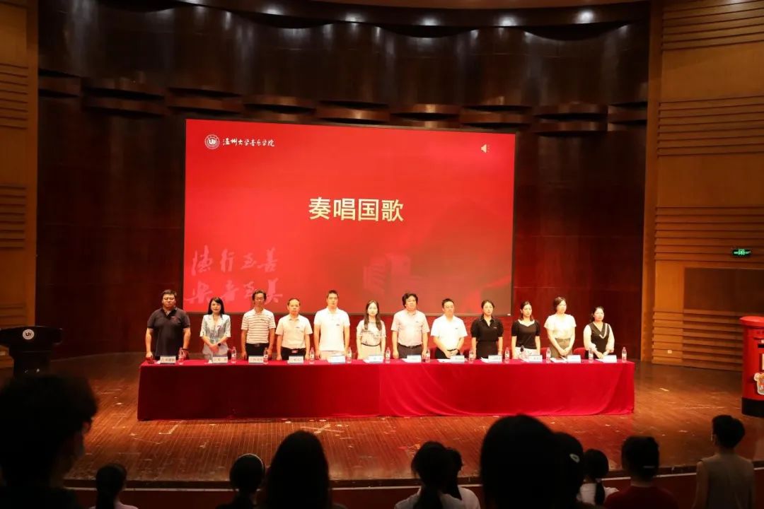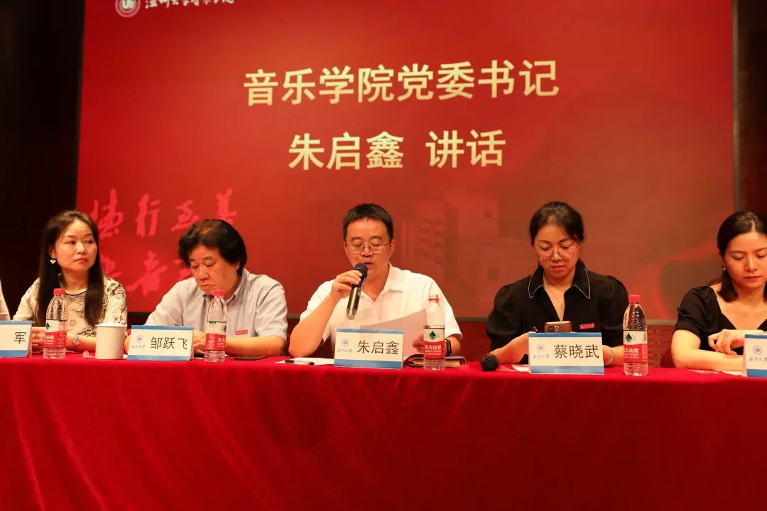 院长邹跃飞发表致辞。他对新生提出了四点要求:第一,坚定爱国信仰,牢记习近平总书记在五四运动一百周年大会上发表的重要讲话,要以爱国之情报强国之志,把个人理想融入国家理想的事业当中,并牢记习近平总书记的深情厚望,找到当代青年砥砺奋进的时代坐标;第二,夯实专业基础,邹院长希望新生们能够充分利用起学院的优秀师资和设备资源来完善提升自我;第三,注重艺术实践,我们身处于多远开放的时代,因此,作为新时代的音乐人,应当重视音乐理论和音乐实践,将理论知识内化整合,融会贯通;第四,肩负时代使命,中国特色社会主义已经进入新时代,我们要紧跟时代步伐,胸怀中华民族伟大复新的梦想,携带“求学问是,敢为人先”的校训精神,砥砺前行,不断进步。