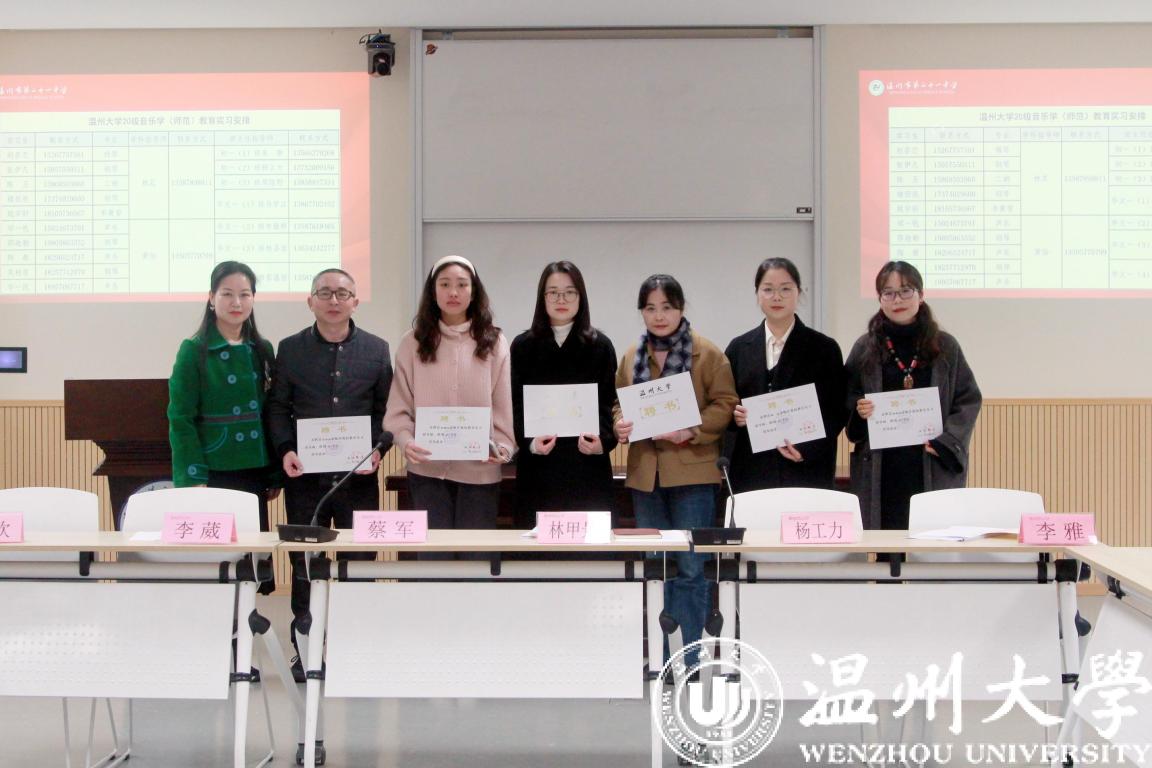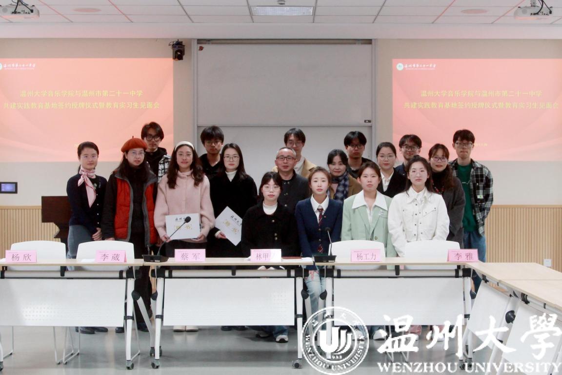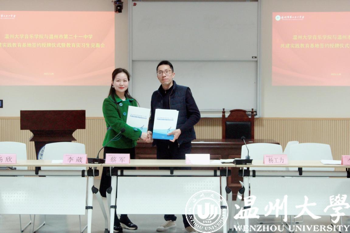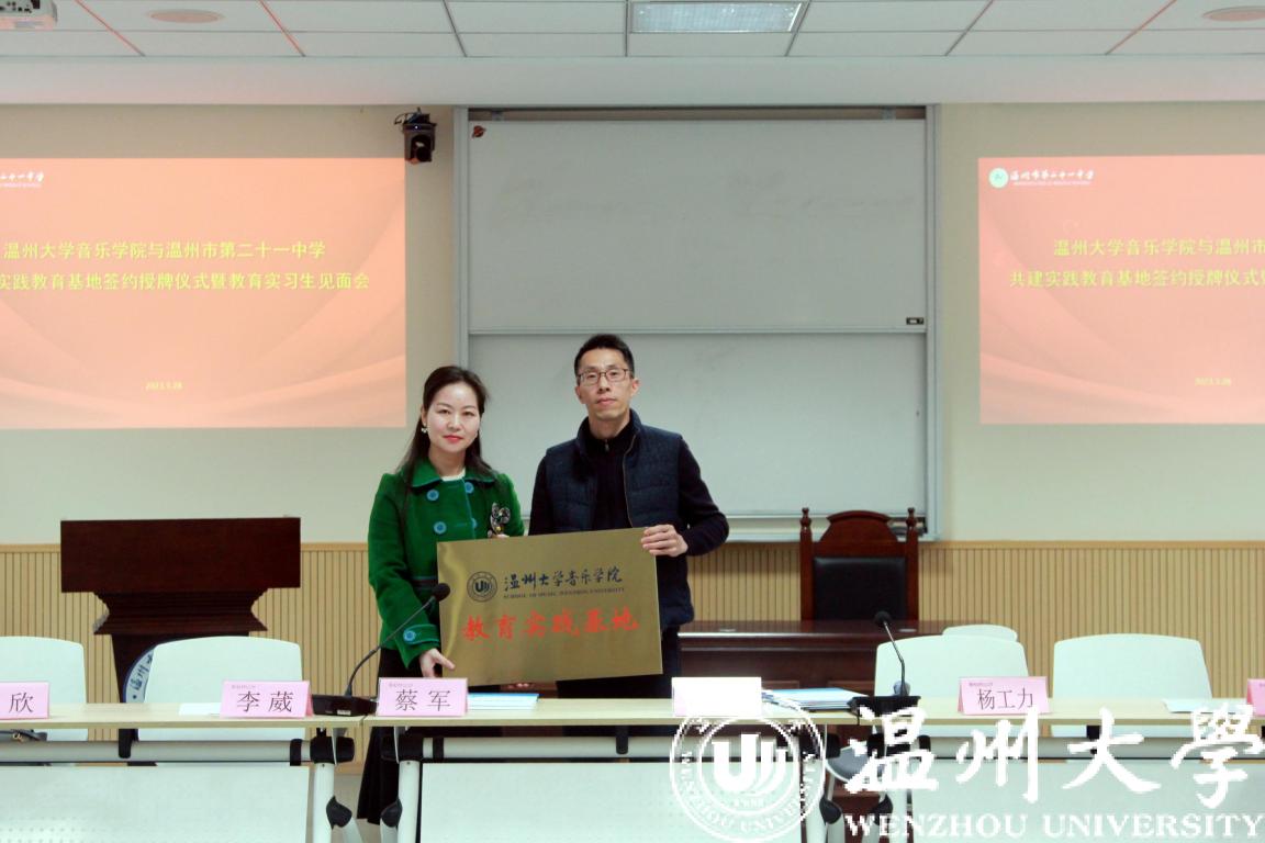 蔡军副院长与温州市第二十一中学林甲景副校长共同签署了教育实践基地合作协议并举行了揭牌仪式。研训处李雅副主任介绍教育实习的班主任和音乐指导师。蔡军副院长为班主任和音乐指导师颁发了聘书。
