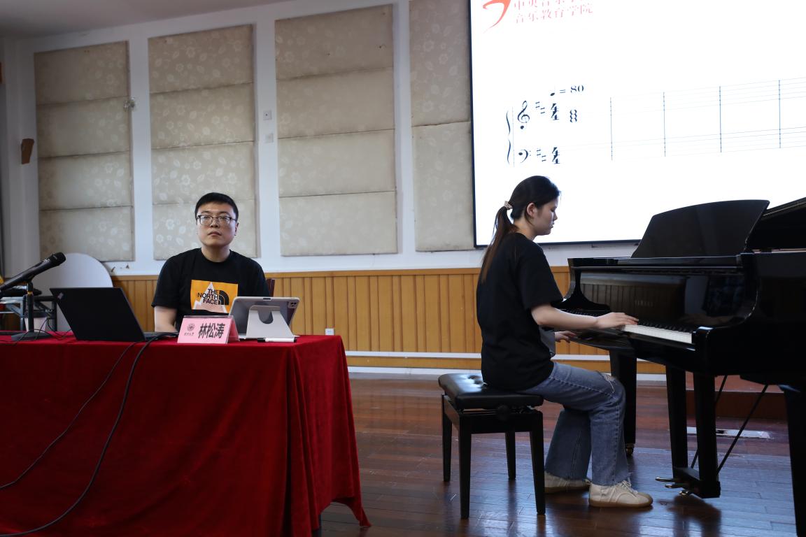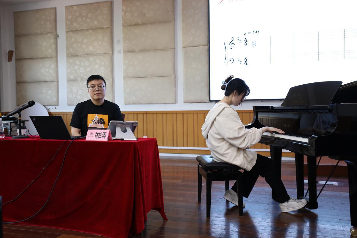 后面林教授给我们播放了巴赫的作品《十二平均律》,然后给我们展示了一个谱例,同学们跟着林教授一起视谱。跟着《十二平均律》的旋律,同学们看着谱例边唱边感受着旋律,唱出了非常优美的旋律。后面,同学们自由选择想要演唱的声部,大家一起配合,使整首曲子听起来更加优美动听。