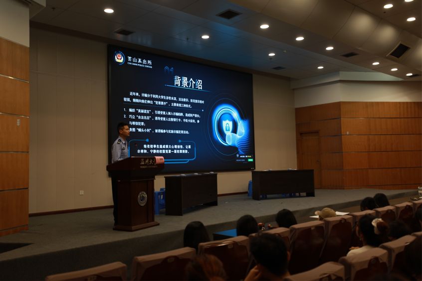 本次讲座,我们有幸邀请到了茶山派出所的史铁军警官。史警官通过讲解“什么是电信诈骗”,例举了常见的几种诈骗形式,用生动的宣讲告诉同学们如何防范电信诈骗,并希望广大学生能够时刻提高警惕,保护好自己的财产安全。