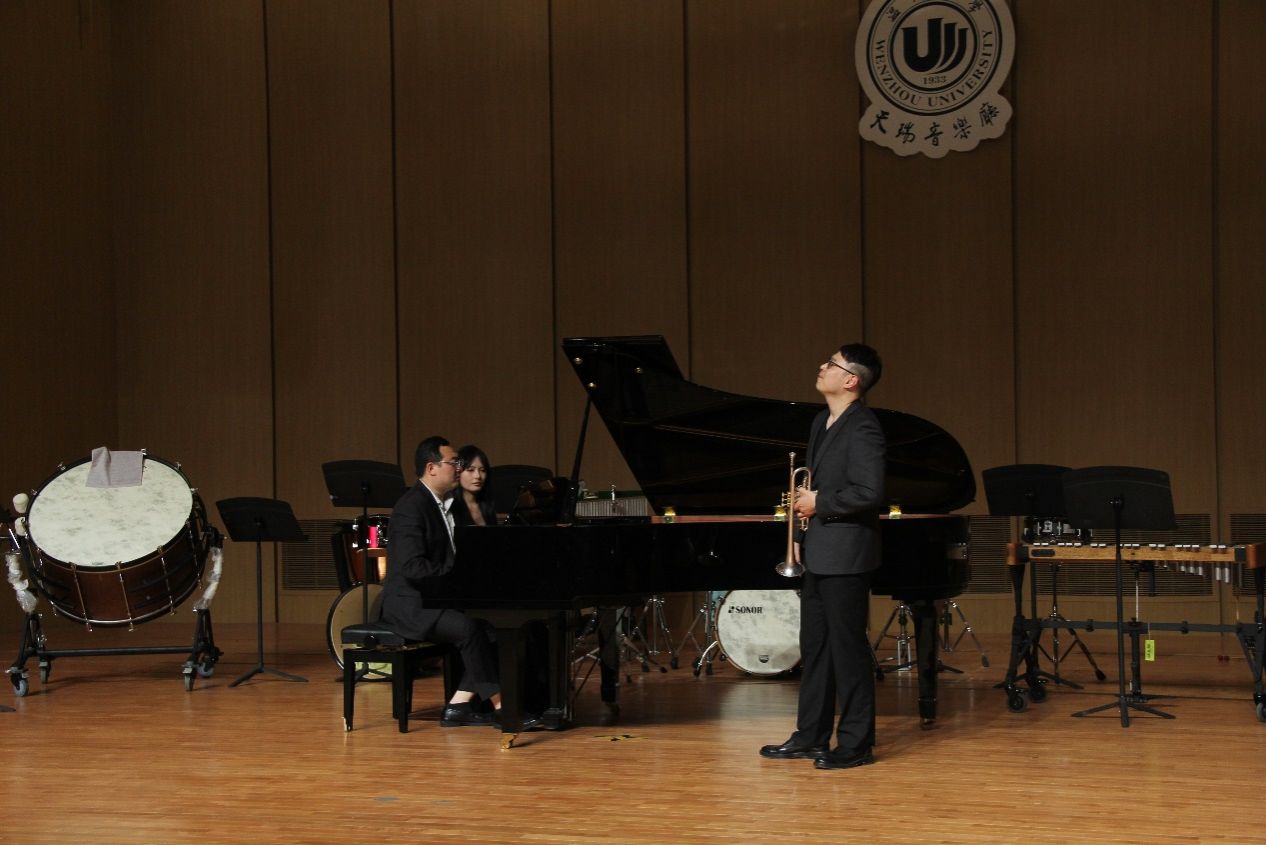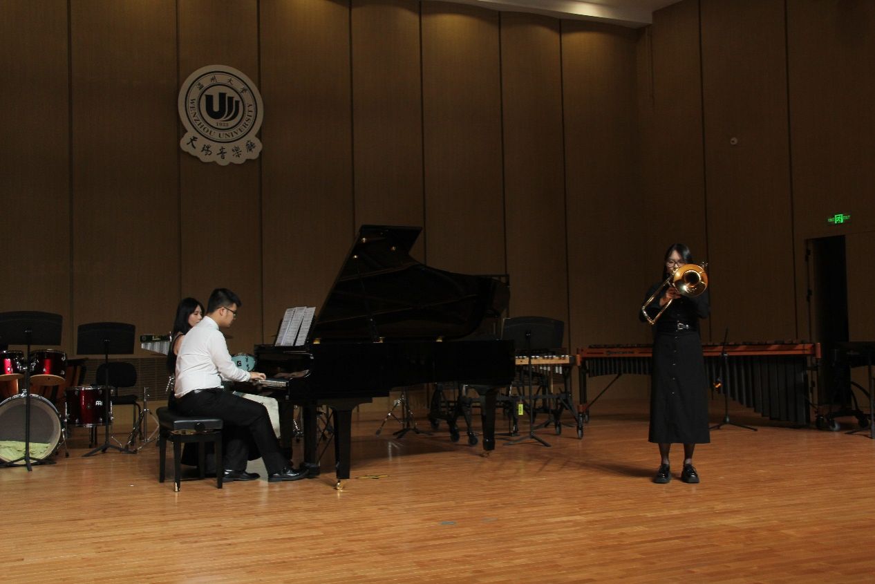 接着是由郑雨同学携钢伴唐声荣同学带来的长号演奏《查尔达什》,这首曲目是由小提琴改编而来,很好地为我们展现了乐器跨界演奏风格。随后尤泽博和朱文静演奏的《牛斗虎重奏》让人印象深刻,给人带来了很强的震撼。紧接着第四第五曲分别是《秋叶》和《伦敦德里小调》,演奏完毕,卢梦滢老师携崔议文、朱文静、朱丽娜等学生带来的《科技先锋》,各种形态的乐器相互配合,相互合作,构成了一个和谐的音乐情景。《节奏之旅》为我们展现了肢体打击乐的表演形式。