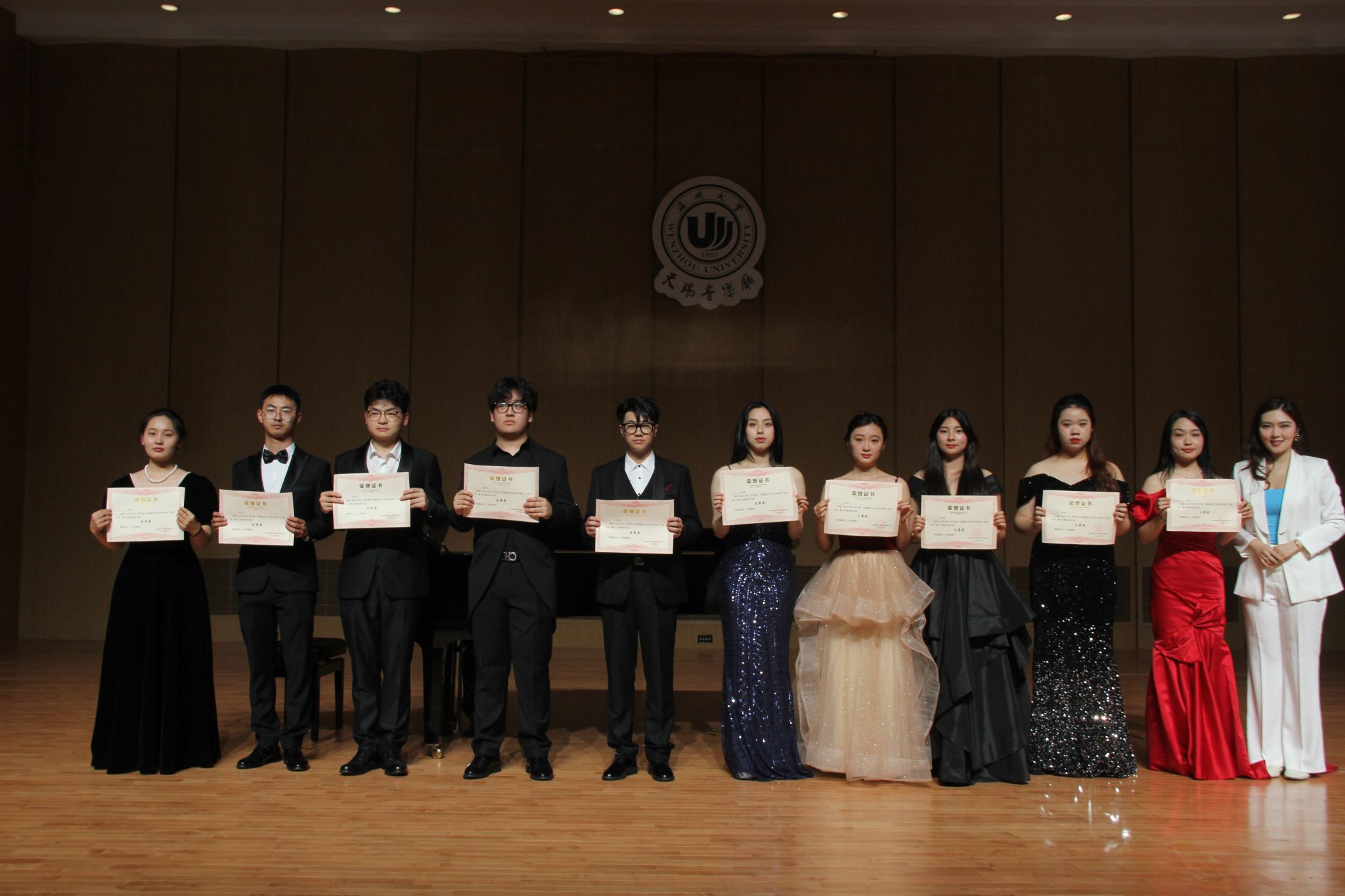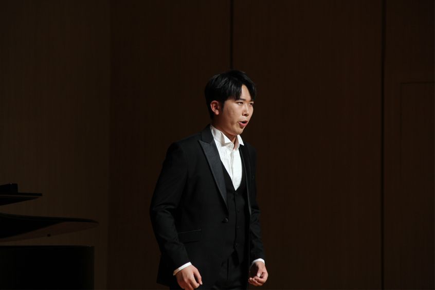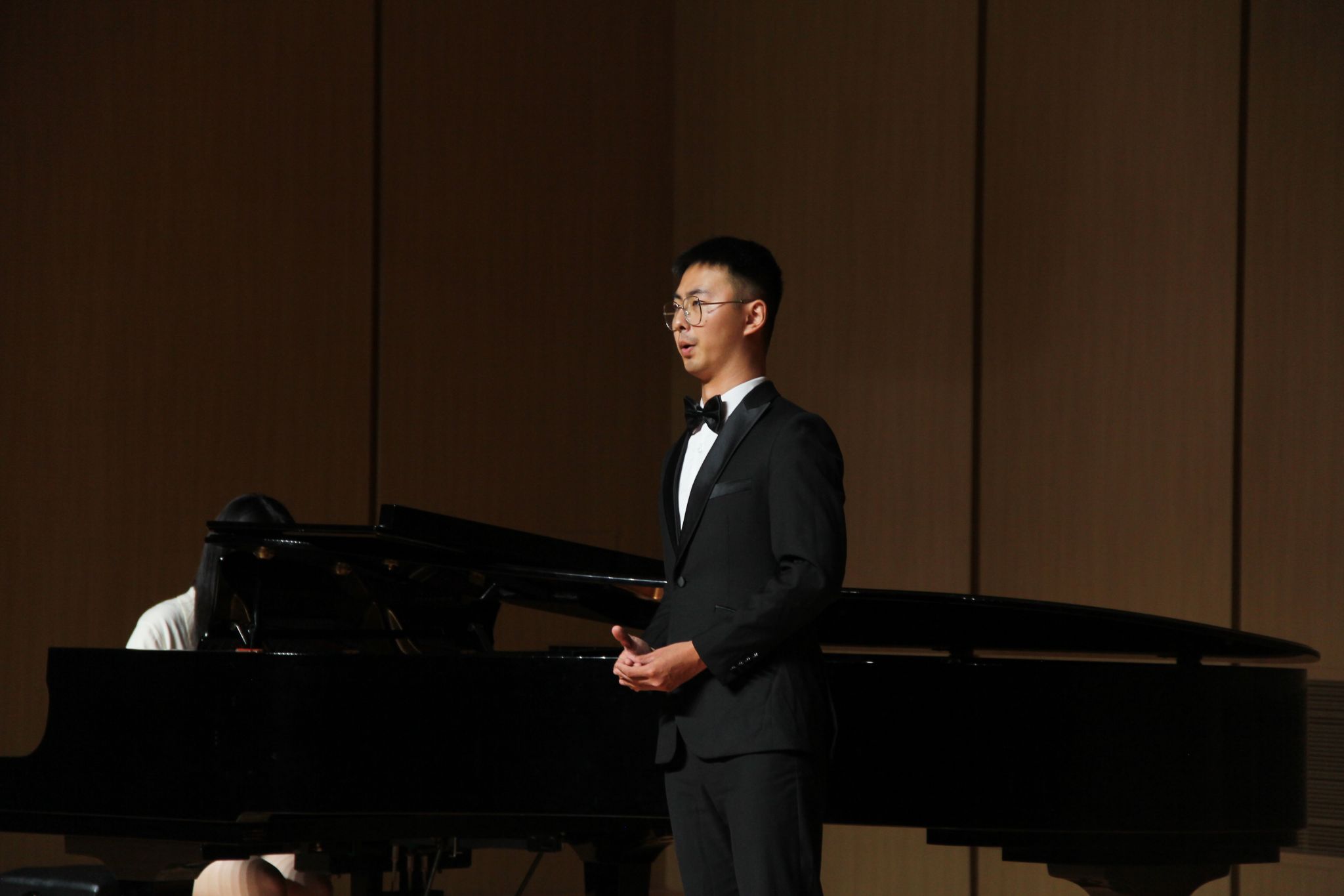 在这之后本科生与专升本组选手进行演唱。陈雨同学带来的《年轻姑娘应该懂得》歌声充满力量展现了年轻姑娘的坚定和勇敢。何润同学的《想亲娘》深情款款,他以真挚的情感和细腻的嗓音,将歌曲中的思念和牵挂表达得深入人心。康奕琳同学演唱的《念奴娇·赤壁怀古》让在场的观众无不为之动容。古小玉同学带来的《我去向何方》以其深情的演绎,展现了歌曲中的迷茫和追求。李咏静同学演唱的《幽兰操》以悠扬婉转的曲调和深情的演唱,展现了幽兰的高雅和坚韧。王聪慧同学带来的《锦瑟》将歌曲中的哀怨和无奈演绎得入木三分。雷森伟同学演唱的《故乡》则以其豪放的嗓音和深情的演绎,将歌曲中的思乡之情表达得淋漓尽致。金昌民同学演唱的《春花秋月何时了》歌声如同春水般柔和,又似秋月般明亮,表达了人生的短暂和无常。陈嘉慧同学演唱的《不答应也得答应》以其清澈透亮的嗓音,将歌曲中的情感表达得细腻而真挚,赢得了观众们的阵阵掌声。最后郭骏同学深情的演唱和精湛的技艺,成功演绎了《美妙的时刻即将来临》这首曲目。至此所有选手演唱完毕。