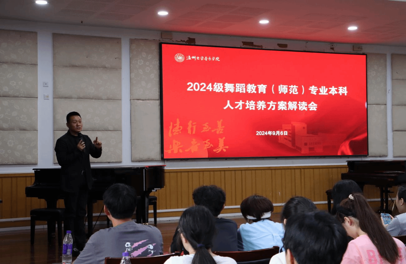 其次,舞蹈系主任李良教授为2024级舞蹈教育(师范)专业的本科新生解读人才培养方案目标、课程、毕业要求等。李良教授强调培养学生的综合素质和创新能力,通过系统的课堂学习和艺术实践,让学生具备“能跳、能教、能编”的能力,继而成为适应新时代舞蹈教育发展的专业人才。