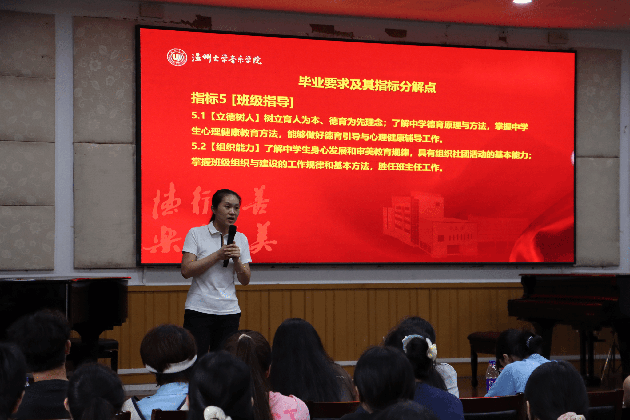 首先,教学副院长张潇潇详细介绍了2024级音乐学(师范)人才培养方案的培养目标、毕业要求及指标分解点、课程体系及主干课程。学院注重课程的系统性和丰富性,不仅有多样化的课程内容,而且通过艺术实践,使学生能够将理论与实践相结合,知识与能力共提升。同时,鼓励学生根据自己的兴趣和职业规划在选修课的模块进行个性化学习。