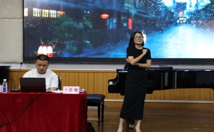 吴老师现场分享了她在参加全国普通高等学校音乐教育专业本科学生和教师基本功展示比赛时的经验,以微课展示环节为例,通过生动的教学案例《听雨》,讲解如何将理论知识与实践操作相结合,以及如何激发学生的学习兴趣和参与热情。