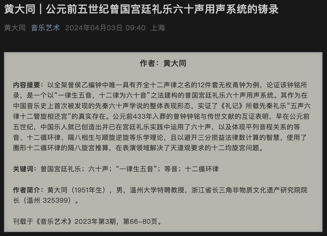音乐学系黄大同教授主持的国家社会科学基金重点项目“曾侯乙编钟乐律学体系研究”圆满结题。该项目自2018年立项历时五年,以曾侯乙编钟和编磬的乐律学铭文及其测音结果作为研究对象,对曾侯乙钟磬的乐律学体系进行了评述和分析,重新解读了‘变声有何作用’‘六律如何旋宫’等问题,并在此基础上揭示曾钟曾磬铭文的主题、内容与内容生成法等问题真相。《曾侯乙编钟钟铭的“五音不全”表象探究》、《楚国十二律名的结构生成逻辑与其律制隐含》、《曾侯乙编钟十二声名结构样式与生成之推导(上/下)》、《公元前五世纪曾国宫廷礼乐六十声用声系统的铸录》等多篇研究成果发表在核心期刊上。