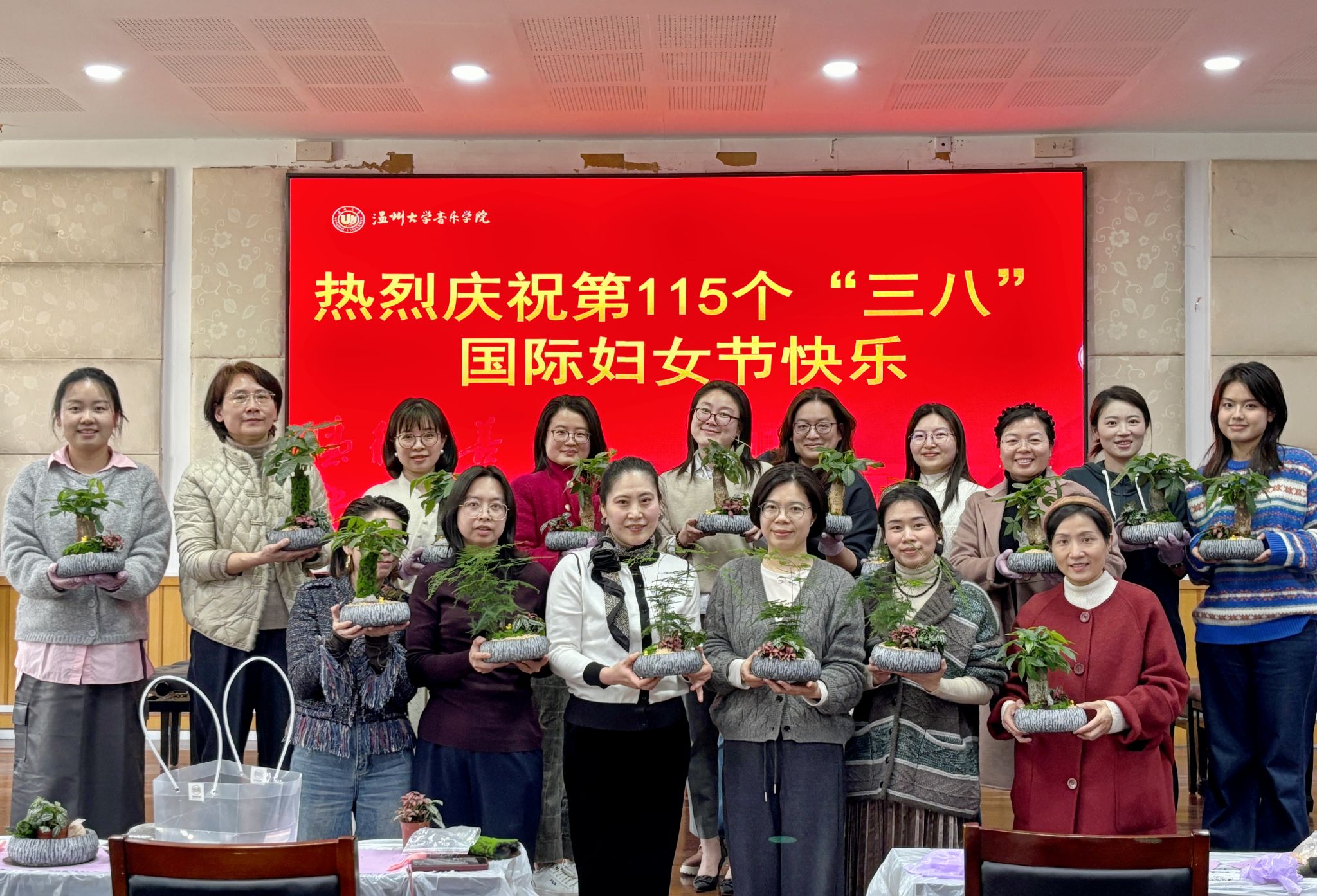 活动现场,园艺师为大家详细讲解了盆栽种植的基本技巧和养护方法。从土壤选择、植物搭配到浇水施肥,每一个步骤都细致入微。女教职工们认真聆听,积极提问,现场气氛热烈。随后,大家纷纷动手,挑选心仪的花盆和植物,亲手栽种属于自己的“迷你花园”。在种植过程中,大家互相交流经验,分享生活中的绿色小妙招。一盆盆充满创意的盆栽作品逐渐成型,展现了女教职工们的巧手匠心和对生活的热爱。活动结束后,大家捧着自己亲手种植的盆栽合影留念,脸上洋溢着满足的笑容。