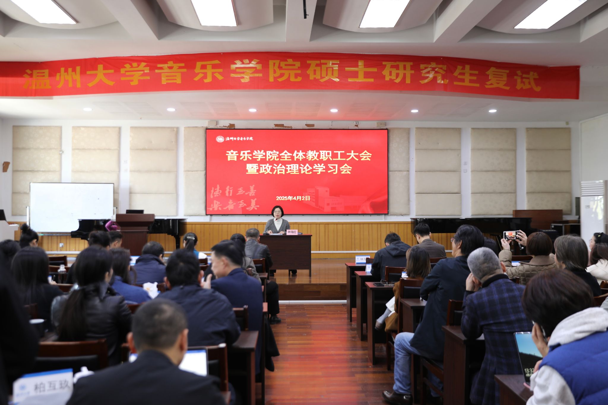 在音乐楼201报告厅召开全院教职工大会暨政治理论学习会。会议由学院党委副书记、纪委书记林海红主持。