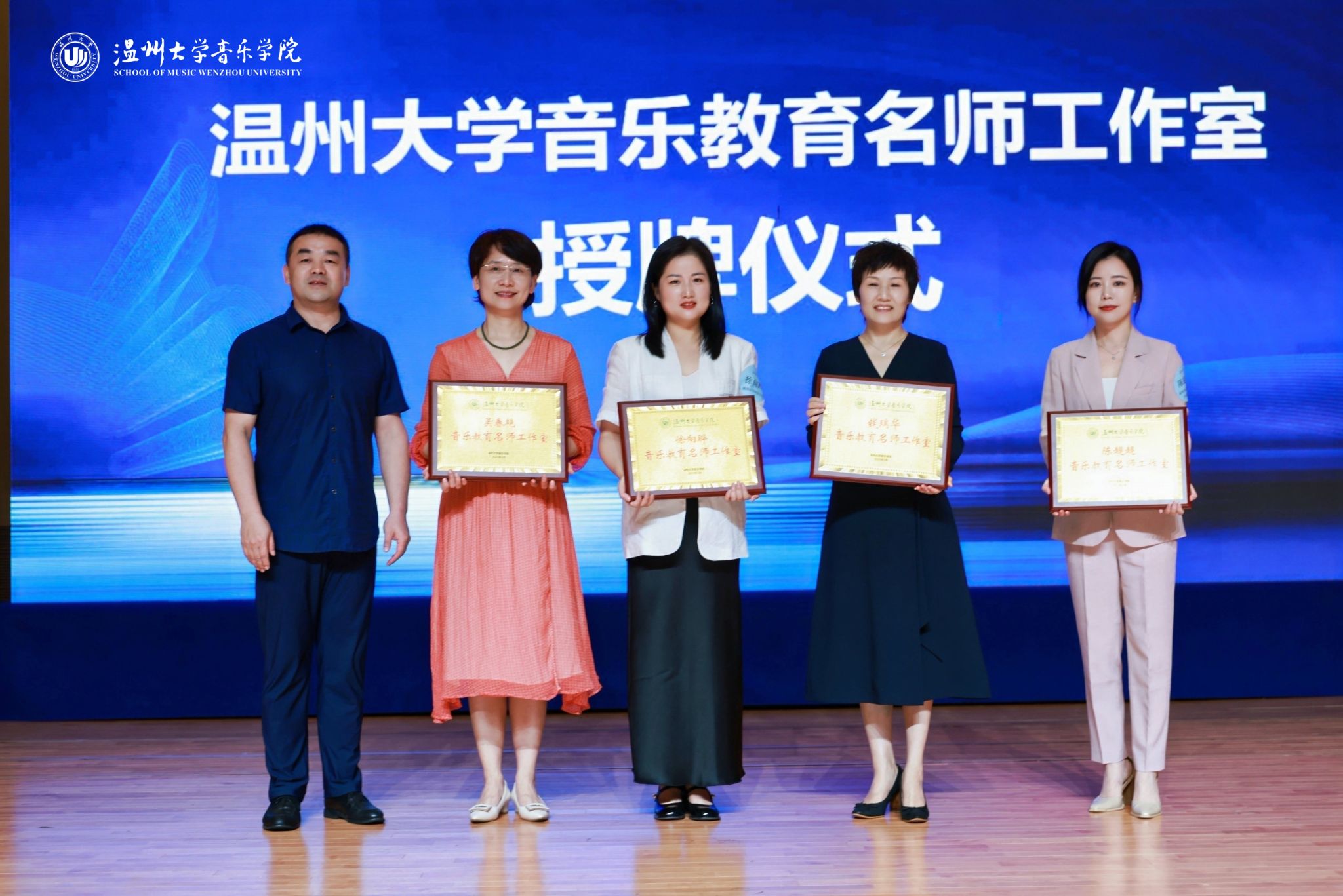 主持工作副院长张寅教授宣布工作室成立,并介绍了工作室概况。首批成立的四家名师工作室分别为:“钱瑞华音乐教育名师工作室”“陈超超音乐教育名师工作室”“徐向晔音乐教育名师工作室”“吴春艳音乐教育名师工作室”,名师工作室将为广大音乐教师校友提供专业成长的优质平台,通过名师引领、资源共享等方式,提升教师的专业素养和教学水平,助力区域音乐教育发展。随后,张寅院长为四位工作室负责人钱瑞华、陈超超、徐向晔、吴春艳授牌并合影留念。