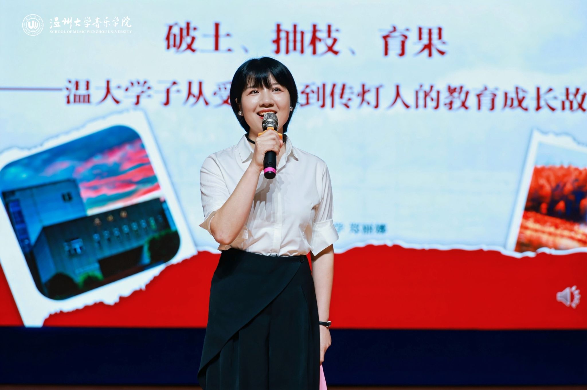 中国教育学会2022音乐学科“云课堂”示范课例一等奖、全国中等职业学校素质教育课程“创新杯”教师说课大赛一等奖获得者郑丽娜,分享了自己从温大学子到一线名师的职业历程,生动诠释了“教育是一棵树摇动另一棵树,一朵云推动另一朵云”的深刻内涵。