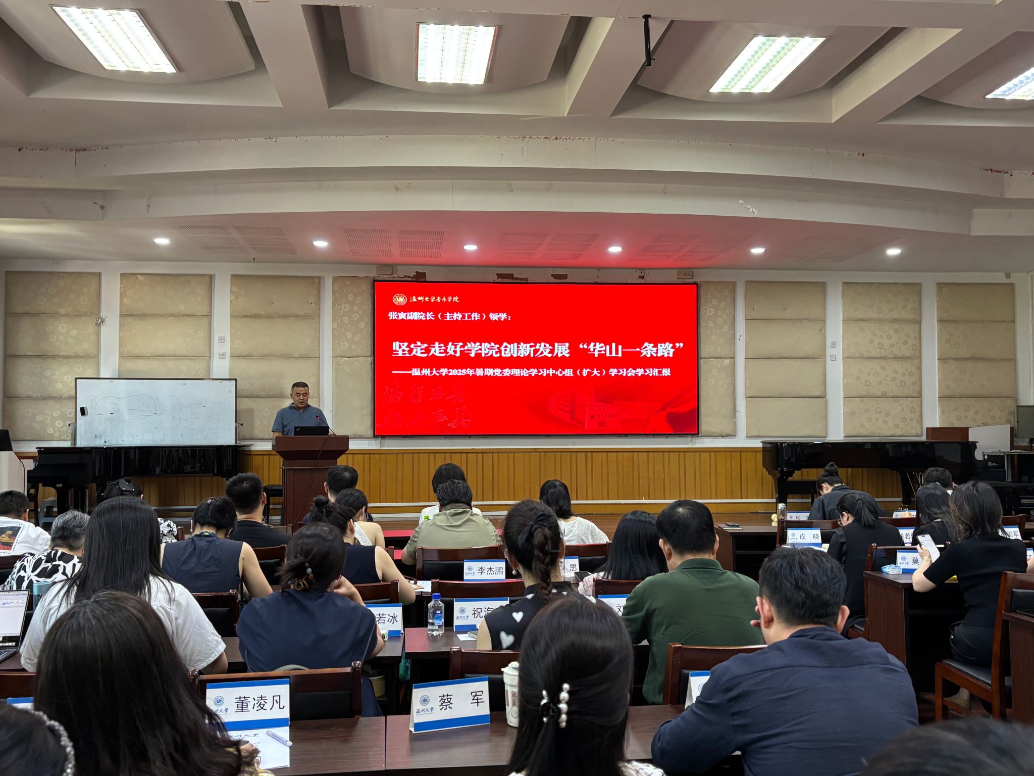 2025年暑期党委理论学习中心组(扩大)学习会精神,作了题为《坚定走好学院创新发展“华山一条路”》的专题汇报。他深刻指出,必须在人才培养、科学研究、治理体系、国际化和社会服务等多个维度实现变革与突破。他强调,学院将深化教学改革,推行混合式教学和跨学科培养;面向人工智能、虚拟现实等前沿领域,引育人才,加强产学研协同;推进学院管理去行政化、制度化和数字化;积极拓展海外联合培养和本土国际化项目;深化服务地方,支持艺术创新创业和展演成果转化。