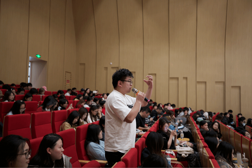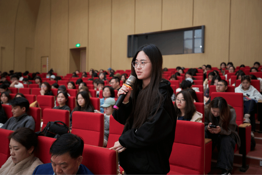 在互动环节,严教授针对学生提出的共鸣和咬字问题,直击核心症结、精准答疑解惑。他回答道,共鸣位置的集中性直接决定声音的穿透力与质感,而咬字作为连接语言与声音的关键,需要兼顾语言规范与发声特点,做到清晰而不僵硬、圆润而不模糊,让每一个字都能随着旋律自然流淌。