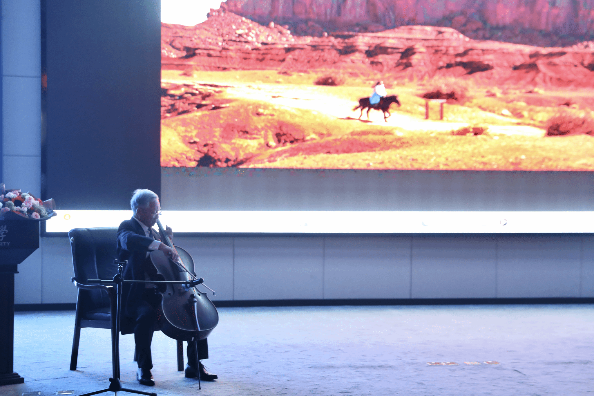 在分享会上,黄甦教授以“从温州走向国际艺术舞台”为主线,结合自身横跨中美的学习与创业经历,通过图片、音乐与演讲交织的形式缓缓讲述他的发展历程。他提出“音乐是开启人生大门的钥匙”,认为严格的音乐基础训练能磨砺意志,舞台实践可培养勇于表达、处变不惊的能力,而广泛的艺术交流更能养成反向思维与正向验证的思维习惯。他还强调艺术学习需兼顾个性与协作精神,让音乐积淀成为塑造品格、赋能跨界的底气,助力学子成长为兼具专业能力与综合素养的社会人才。黄甦教授还现场演绎了原创作品《印第安私语》,大提琴的悠扬旋律与其拍摄的自然风光影像相融,赢得全场掌声。