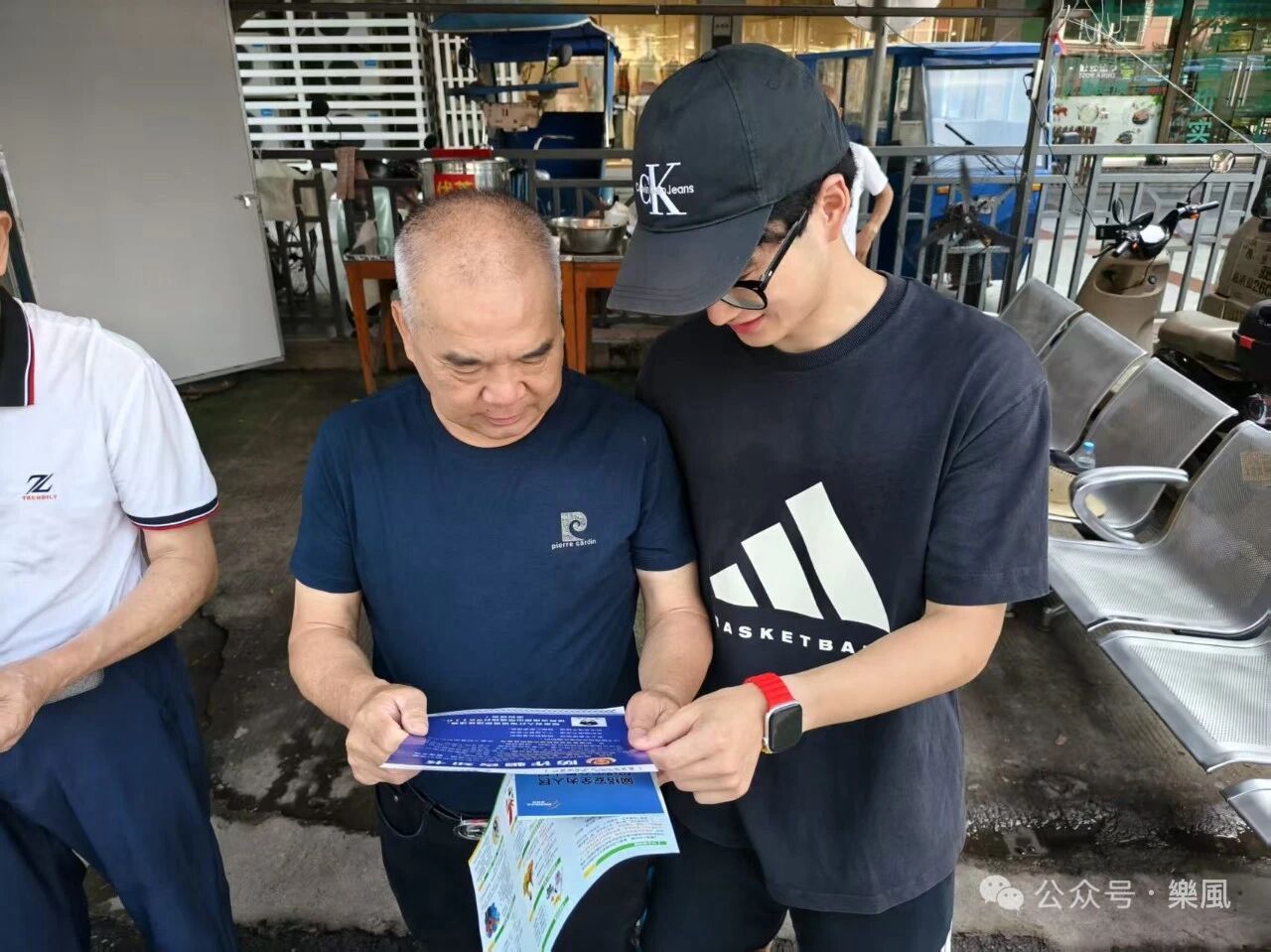 社区活动中心的小广场上,红色的"艺启来反诈"横幅在树荫下格外醒目。几张蓝色折叠桌拼在一起,铺着印着"防范电信诈骗,守护财产安全"的桌布,上面堆着厚厚的传单和手册﹣﹣封面上印着卡通警察形象,配着"陌生来电要警惕,核实清楚再相信"的标语。