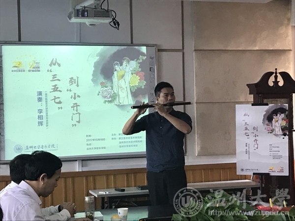 第四场是内容是《从“三五七”到“小开门”》,温州瓯剧院青年演奏家李相辉先是介绍了《三五七》和《小开门》两个曲子在瓯剧中的运用,再用曲笛分别演奏。
