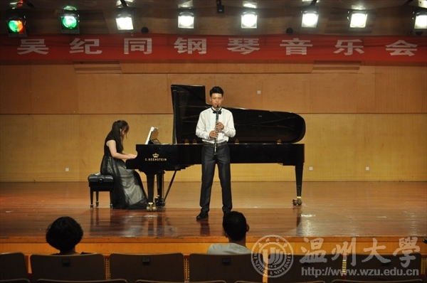 在北校区天瑞音乐厅举办了吴纪同钢琴毕业音乐会,本次音乐会表演者是我院13级师从胡敏老师的学生吴纪同,特邀嘉宾是赵福生、吴天同,主持人是陈倩倩。