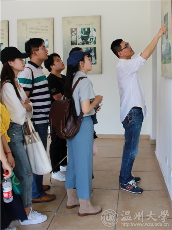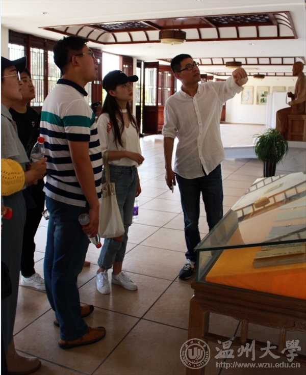 烈日炎炎,但同学们热情依旧高涨。在温州弘一法师纪念堂内,首先,赵玉卿院长向大家简单介绍了李叔同(弘一法师)的生平,包括他的游学背景和学堂乐歌的创作背景。李叔同(弘一法师)虽为富家子弟,但是并没有游手好闲,他坚持刻苦学习,琴棋书画样样精通。他超脱世俗纷扰,潜心治学,最终有所成就。他对学习的热衷和超凡的毅力是我们学习的榜样。之后,同学们参观馆内展示的文物,并就自己对李叔同的认识提出疑问,赵老师耐心解答了同学们的疑惑。