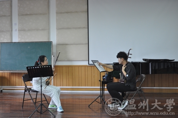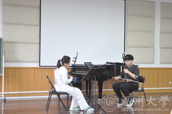 第二场公开课是由杨欣老师带来的《二胡技能课》,在该场公开课中,杨欣老师让学生拉的是刘天华的《月夜》。首先杨老师让学生要知道该曲子的写作背景,了解每一个乐段所表达的思想感情,杨老师带领学生从细节入手,一一示范讲解其中的滑音,装饰音,以及每一个音所需要注意的地方,学生收益颇深。第一乐段以极慢板开始,二胡用流畅的运弓、运指及精微细致的揉弦、换把处理,将人们带入了一个天高气爽,风轻恬静,一轮明月初升,夜霭如霜的诗情画意美好月夜。第二乐段是乐曲的核心段落,对运功的要求和左手的控制要求较高,一弓多音的演奏,使乐曲增添了不安定的因素。第三乐段不但演奏速度由原来的极慢板转变成快板,而且力度也由一开始的mf和p两种力度加强到了f。从而表达作者热爱,憧憬,追求美好生活的强烈愿望。