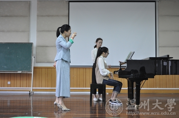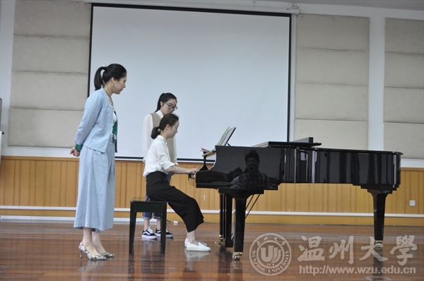 第三场公开课是由王晓佳老师带来的《钢琴技能课》,首先王晓佳老师让学生弹了《哈农》热热手,接着就是开始教学生们转换调式,怎样用A调的方式来分解和弦和半分解和弦即兴伴奏C调的《送别》,然后便让学生弹奏《849练习曲》中的一条,让 学生相互评价后老师再来指导,老师希望学生能互相学习,学会聆听和学习分辨,不能只知道自己努力练习,也要让自己的耳朵更灵敏,要会分辨好的和坏的。该练习曲有两个声部,高音应该用手腕旋转的力量弹重音,要松弛,音色不能散。旋转下去的力量要集中在指尖,注意力集中,学会感受三连音的律动感。