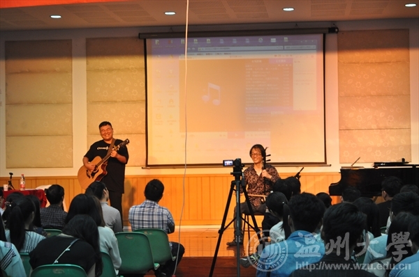 最后,姚新峰老师邀请了两位同学即兴上台表演,姚新峰老师即兴伴奏,配合默契,大家热情高涨,意犹未尽,老师又随机三名同学选了MiSolDo三个音用二胡即兴演奏,曲毕,大家在掌声热烈中结束了这场特别的二胡艺术讲座。