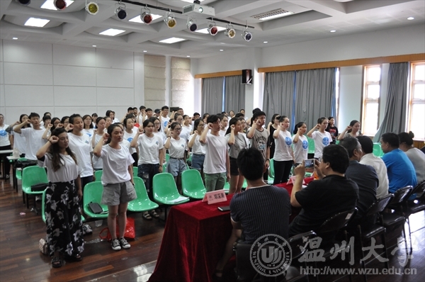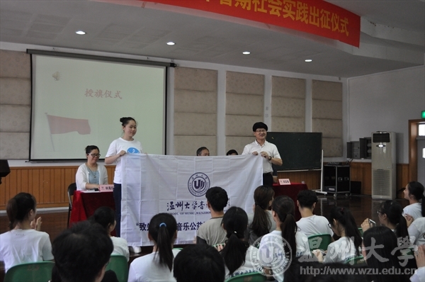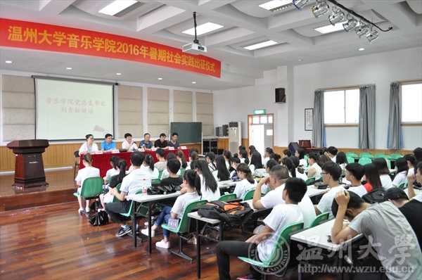刘青松书记致辞,刘书记为同学们解释了暑期社会时间的重要性和必要性。刘青松书记在讲话中指出,适逢G20峰会在杭州召开,希望同学们严守实践纪律,树立温大学子风采,并预祝2016年暑期实践活动圆满成功!接着由实践队指导教师代表李杰鹏老师发言,李杰鹏老师着重强调了实践过程中的安全问题,并表达了希望每个队员都全身心投入到社会实践活动中去并在实践中尽可能的提升自己的美好愿景。致知艺术音乐公益课堂暑期社会实践队的队长王超同学作为学生代表进行讲话,进一步为同学们明确了暑期社会实践的目标和任务。在仪式中,JJGirls