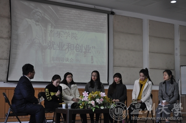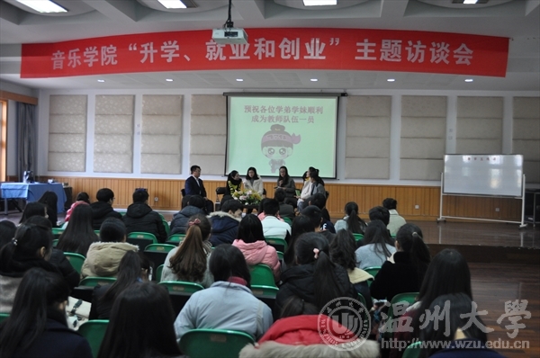 音乐楼201隆重举办。本次“升学、就业和创业”主题访谈会邀请到了01级校友温州市天之音艺校校长陈红红、温州市岠江小学教师黄怡甜、JJGirls