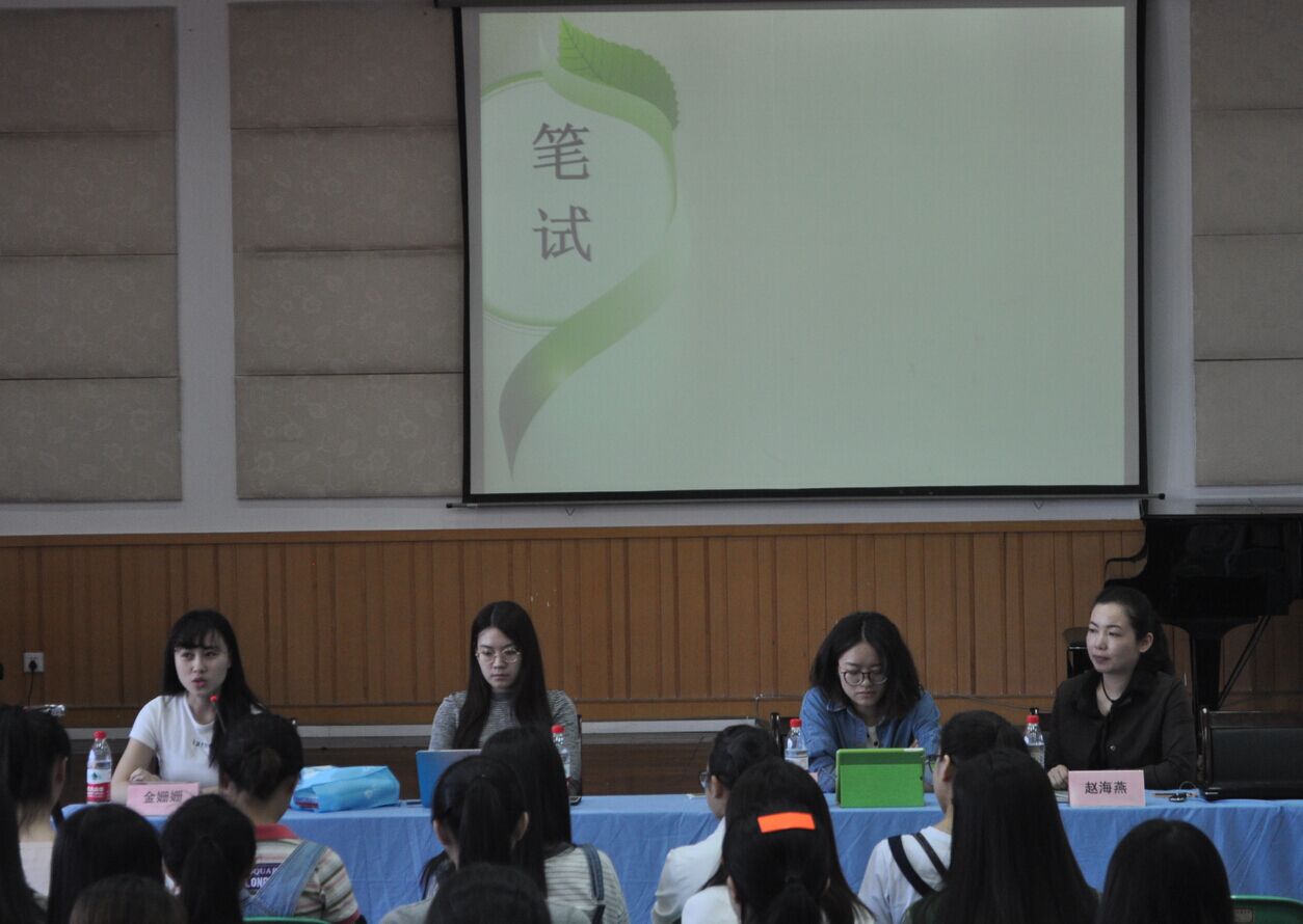 瓯江学院,现就职于瓦市小学,担任校合唱团指导师。接着由金姗姗向大家介绍笔试部分,她向大家推荐了几本书:《音乐知识应考速成》、《教师招聘考试》、《浙江省教师》等。向大家分享了她当年考试时候的学习方法。要合理的制定计划。第一轮:1.划重点(书上):人物作品等。2.做配套单元题。3.整理(笔记本)。第二轮:做真题。一天至少要做3份真题模拟卷(要背答案)并且每天要复习错题,整理好错题集。第三轮:回归教材,复习做过的试卷、整理错题。然后,由李芸芸介绍考编面试的技巧。面试的形式分为说课和试讲。说课,根据申请人的学科选定内容,在规定时间到制定地点集中,通过抽签方式确定说课课题,并在封闭情况下,不借助参考资料独立设计出教学方案,在指定的备课教师做好说课准备,时间为60分钟,说课原则上15分钟内。说课也要有一定的技巧,各位领导、老师们,你们好!今天我要进行说课的主题是……。下面,我对本主题进行分析。一、说教材的地位和作用。二、说教学目标。三、说教学的重点和难点。四、说教法。、五、说学法。六、说教学过程。在试讲的时候,要有信心,讲课要有激情,如果抑扬不足,起码声音要大,讲话的语速不要太快,如果拿捏不好,可以多多演练。在试讲前要做好充足的准备,把要讲的内容的相关背景等结合起来,让背景知识在吸引人的同时把人引导到课本的内容上来。其实最重要的,是要关注自己当地的教育网站,关注招考的信息,以免错过考试。最后,由张诗嘉老师向我们介绍教师考编的流程。1.报名 2.资格审核 3.领取准考证 4.参加笔试 5.领取面试转考证 6.参加面试 7.体检 8.公示 9.上岗。报名要多关注所在地教育局的网站,每年教师招聘的时间,网站上会出示公告,根据公告中的报名地点,时间,以及程序等,来判断你是否参加入编考试。