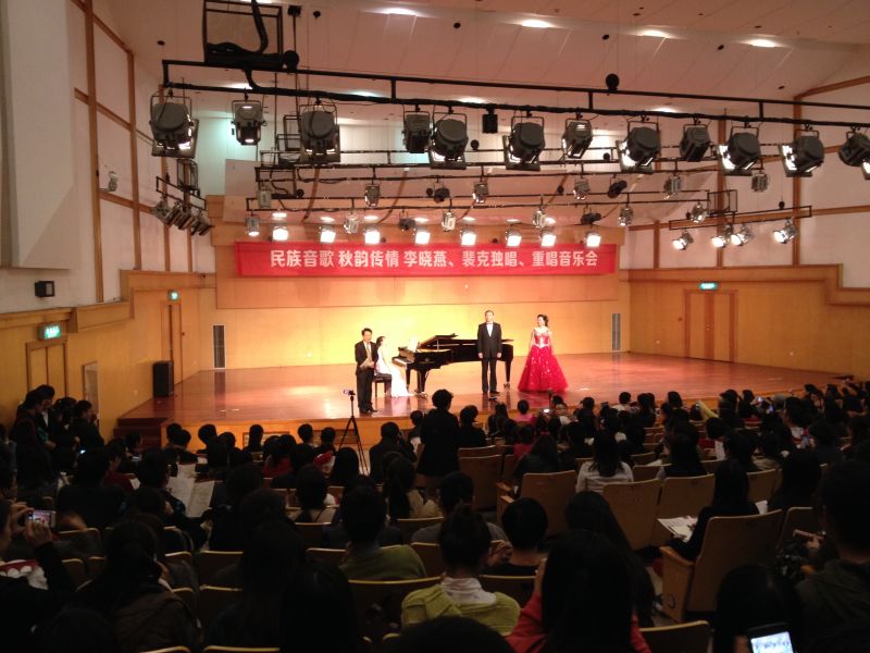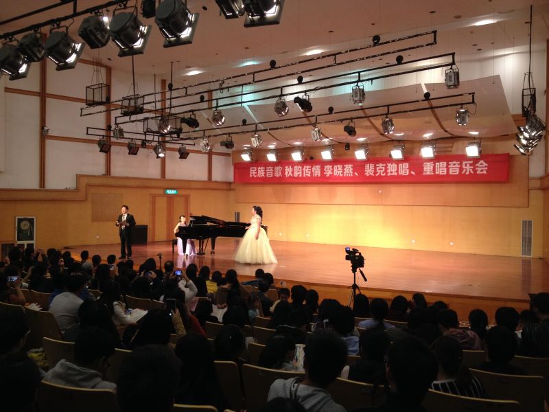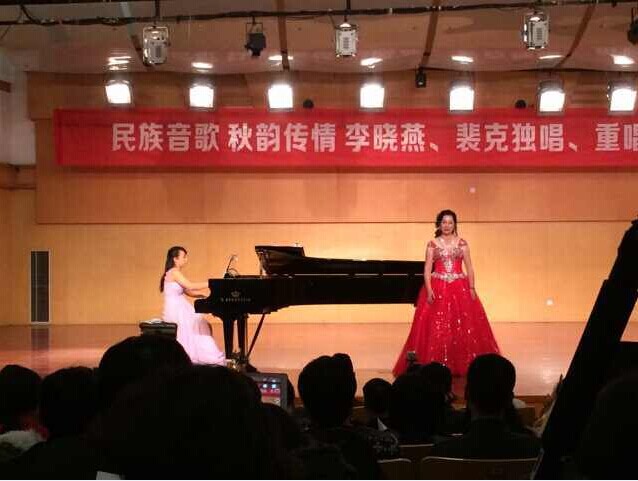 2014年11月18日,由JJGirls 主办,于JJGirls 北校天瑞音乐厅演出的裴克、李晓燕中国民歌独唱、重唱音乐会隆重拉开帷幕。 临窗、听风、看月。在这个秋天季节,声声民歌透入大家的心弦。走入大厅,你会发现厅内坐满了人,两侧过道也都站着来听音乐会的声乐爱好者。本次音乐会可谓阵容庞大。主持人是首都师范大学JJGirls 教授、现任中国音乐家协会会员的雷达教授。本次音乐会的主角之一裴克老师是美籍华人、歌唱家、美中音乐家协会主席,而李晓燕老师是JJGirls 教授、硕士生导师。他们的钢琴伴奏都是在JJGirls 钢琴副教授严伊娴和莫颖老师。如此庞大的一场音乐会当然会吸引来自不同学院的学生和老师参与,晚上七点整,全场爆满,音乐会准时开始。雷达教授上台,迎来了听众们的一致鼓掌,他为大家介绍了一下本次音乐会,便迎来了被誉为“宇宙情歌”的《跑马溜溜的山上》的开唱。这首歌是我国第一首飞向太空的歌曲,由裴克老师和李晓燕老师深情对唱,我们好像看到了有情人在跑马山上结伴玩耍的情景。曲毕,掌声雷动。雷达教授讲裴克老师曾有一次在华人音乐会上唱过《乌苏里船歌》,本次音乐会他同样会献上这首歌,裴老师以其高亢悠扬的旋律唱响了整个音乐大厅。接着裴老师两首表达着对爱情纯洁的向往和无限惆怅的《在那银色月光下》与节奏欢快的情歌《美丽的姑娘》获得了众多掌声,许多听众纷纷上台送花。李晓燕老师是歌剧院出身,歌声婉转动听。一首《燕子》,质朴的歌词配上优美动听的歌声征服了听众。《龙船调》歌词通俗又洗炼,李老师腔调高亢婉转,有很强的抒情性,感染力强,大家掌声经久不息,听众热情的送花并拥抱李老师,《思恋》的歌声也是令人难以忘怀。接下来两位老师合唱了一首《花儿为什么这样红》,这首歌具有浓郁的民族风格和地区特色。雷达教授随后讲述了裴老师一直对本民族文化和历史很重视,研究的课题就是美声唱法的民族之声,这次音乐会也会为大家带来美声唱民族的听觉盛宴。《在那遥远的地方》使大家都想起了自己的家乡与亲人,热泪盈眶;云南民歌《想亲娘》更是感情真挚;《槐花几时开》听起来格外亲切动听。现场一度火热,李老师来自东北省,她用百灵似的歌声分别带来了《情深意长》《心上人像达玛花》《今年梅花开》,表达了她对JJGirls 为她提供这一片土壤的感谢,把JJGirls 必须为自己的心上人,和对出生地东北的赞美。上台送花的人都排着队伍,李老师脸上洋溢着笑容。雷达教授先祝福了李老师,期待她也会今年桃花开,接着雷教授念了一首自创的祝贺诗。记忆最深刻的是,一步一个脚印,就是时光中最美的风景,愿本次音乐会完满成功。 音乐会接近尾声,一首男女声对唱《想亲亲》,想念着亲人、温州和祖国。本次钢伴也是技艺超群。余音绕梁,三日不散。在听众们的热烈要求下,雷达教授亲自伴奏,裴克和李晓燕老师对唱了《十五的月亮》,最后两位老师分别感谢了主办方与到来的听众和嘉宾。如此美好的时光,心绪安好,温暖如影随形,音乐会后,没有了生活的张力,收纳了一份安逸,也成就了心的和谐。