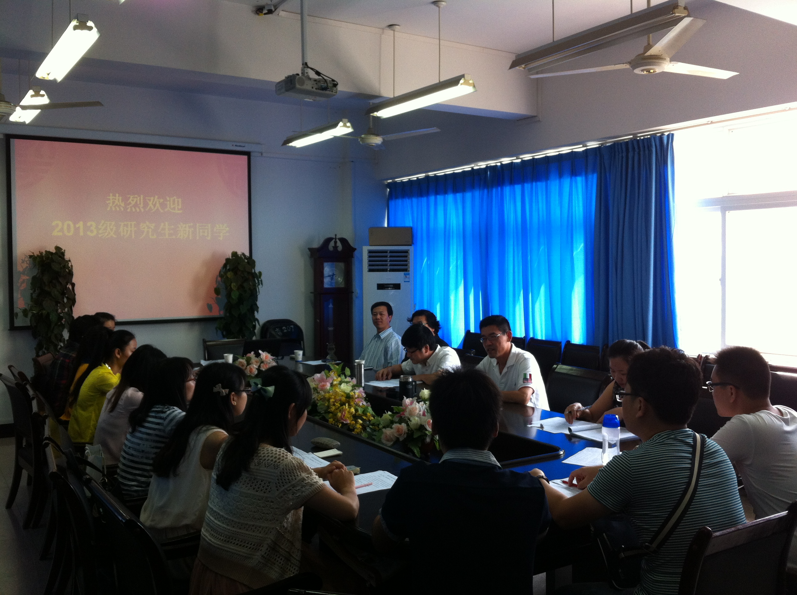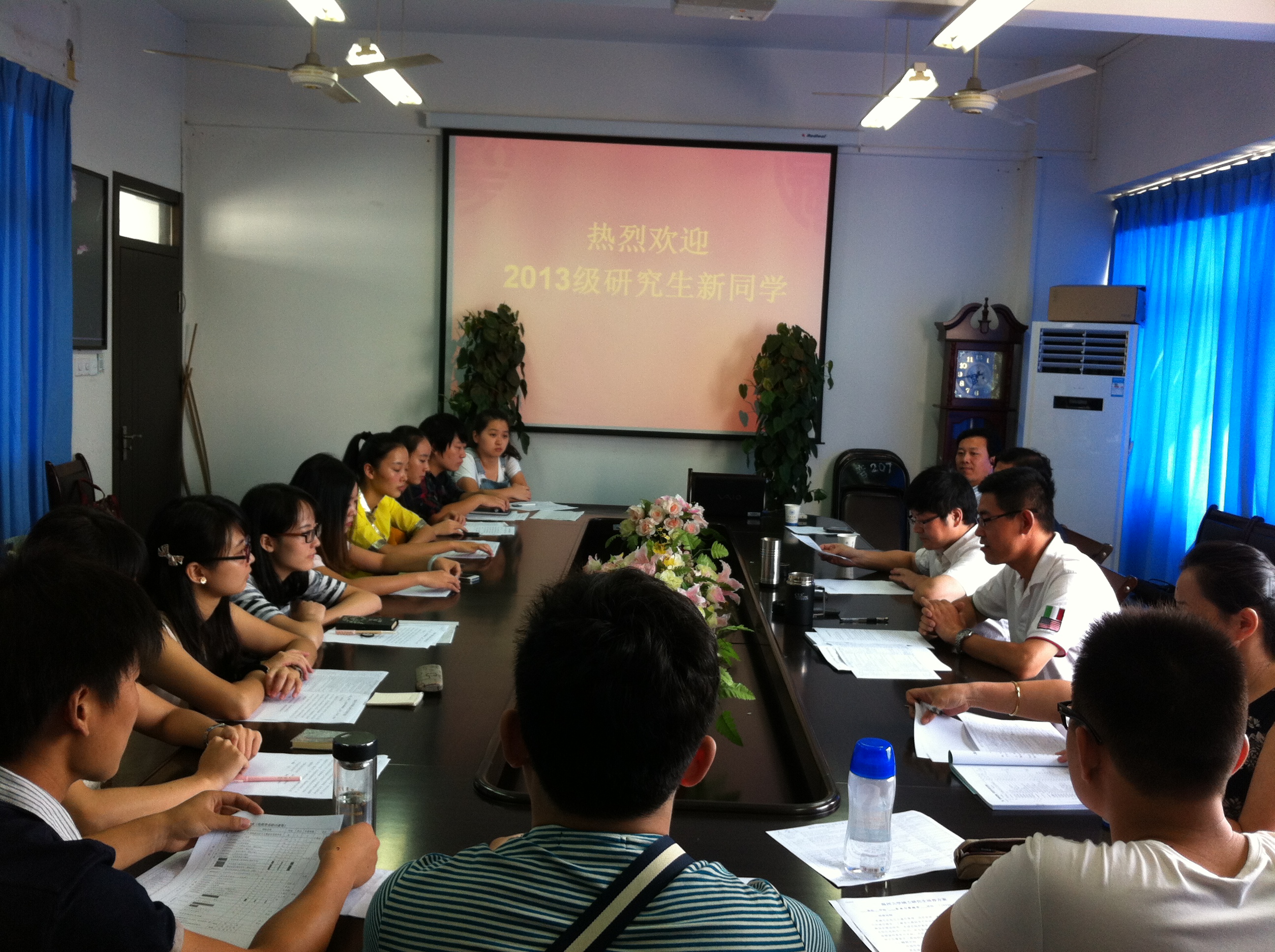 9月5日上午9点30分,我院在北校区音乐楼309会议室举行了2013级研究生欢迎典礼。院长赵玉卿、党总支书记刘青松、副院长李杰鹏、副院长王文韬、研究生秘书蔡根畅、团委书记林海红等老师参加了此次会议。本次欢迎会由党总支书记刘青松主持。