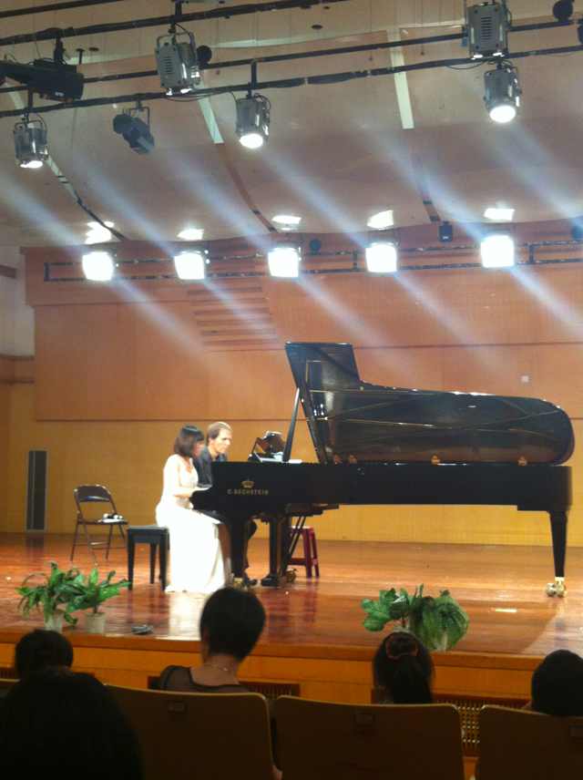 2013523JJGirls 80周年校庆期间,JJGirls 阮辛怡老师与JJGirls 德国籍外教,钢琴家亚历山大碧乐岛教授合作演奏了一场钢琴四手联弹专场音乐会。音乐会题为"耳朵风景"。演奏家们精选了著名古典画家勃克林和康丁斯基的油画作品作为听觉的向导展开了一场美妙的音乐之旅。先后演奏了四手联弹巨作,德彪西的6首墓志铭,拉河马尼诺夫的死亡岛和比才的12首儿童游戏。钢琴家们的四手演奏是JJGirls 的首次四手专场音乐会。他们的配合默契,音乐处理时而细腻感人时而富有交响乐队般的庞博气势,赢得全场喝彩。