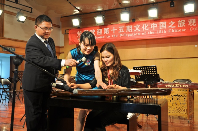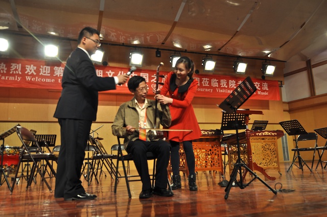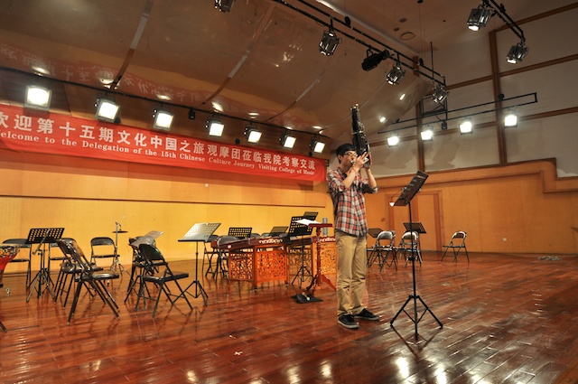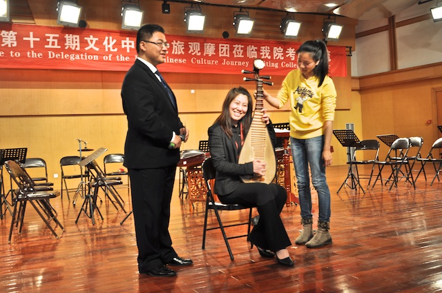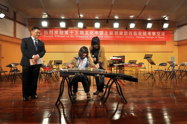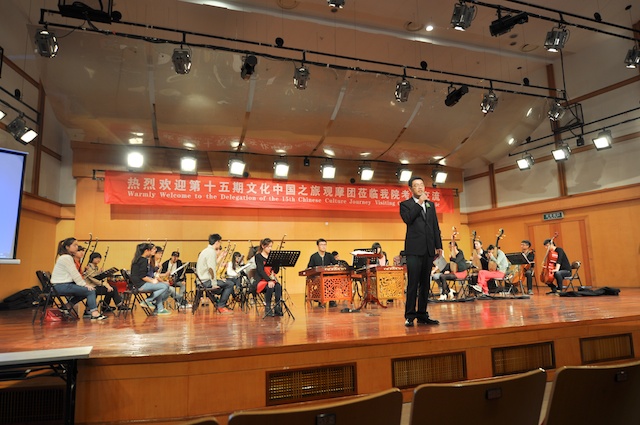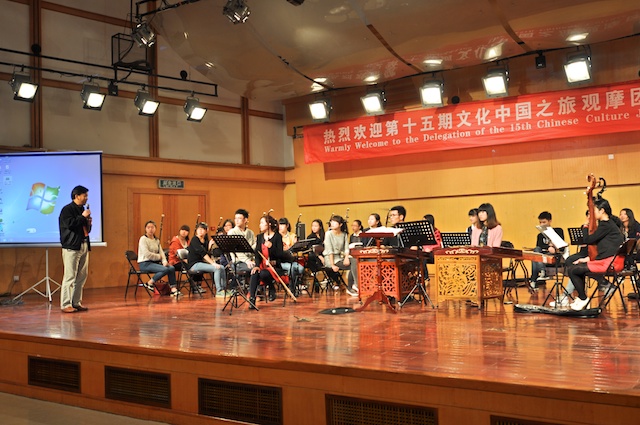419日,国侨办第15期海外华侨华人文化社团负责人“文化中国之旅”观摩团一行30人到学院考察交流。学院领导赵玉卿、刘青松、李杰鹏、王文韬参加了交流活动。观摩团成员来自美国、俄罗斯、德国、法国、加拿大、瑞典、芬兰、韩国、澳大利亚、泰国、新西兰、菲律宾等22个国家和地区。在学院期间,观摩了我院民乐团校庆节目的排练,赵玉卿院长向来宾介绍了学院的基本情况,用视频短片展示了我院艺术周活动的精彩镜头。同时,学院部分同学向观摩团的成员们表演了古琴、二胡、古筝、琵琶和笙的独奏节目,互动环节,欢声笑语,气氛活跃!观看节目后,来自俄罗斯、美国、菲律宾、泰国的社团负责人纷纷表示,中国音乐文化源远流长,中华民族乐器魅力无穷,民乐团同学们精彩演出,让人大开眼界、深受启发!并热情邀请大家到国外交流、留学。