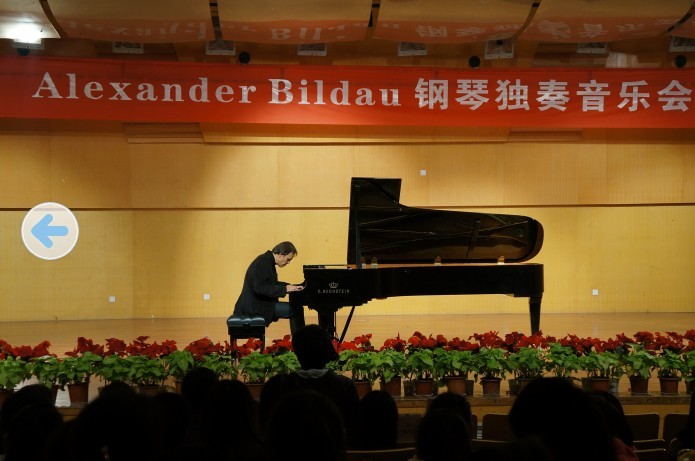 音乐会开场,Alexander Bildau便为在场观众演奏了20世纪重要作品Antheil的《百头无头女》,紧接着的是路德维希•凡•贝多芬的六首钢琴曲和亚历山大•尼古拉耶维奇•斯克里亚宾的前奏曲9首和“奏鸣曲作品64”。一支支风格迥异的钢琴曲将听众们引入到思维的迷宫中,他娴熟独特的钢琴技巧和超强的音乐感染力,更是体现了他扎实的功底和他深厚的艺术修养, 给在座的观众带来了视觉跟听觉的双重盛宴 。音乐会临近结束,同学们为这位出色的钢琴演奏家、亲切的刚请老师送上了鲜花,音乐会在观众们热烈掌声中圆满结束 。