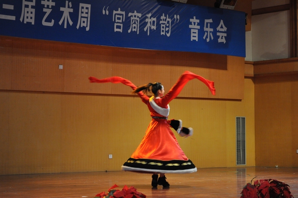音乐会节目精彩纷呈,为大家带来了一场视听盛宴。有女声合唱、女生独唱、钢琴独奏、古筝三重奏、舞蹈、民乐合奏、双钢琴协奏、男生四重唱等10个各具特色的节目,晚会高潮迭起,此起彼伏。开场民乐团合奏《龙腾虎跃》欢快的旋律一下又把观众的情绪调动起来,引来观众阵阵掌声;古筝三重奏、钢琴独奏、双钢琴协奏等节目的演奏为同学们送上了一顿器乐盛宴,女声合唱团带来的《工尺谱游戏》、《樱花》带我们游览了音乐的街廊;男声四重唱《阿拉木汗》为整场晚会的气氛增添了不少色彩;舞蹈《竹二青,妹儿红》让人仿佛置身于舞者们之间,让人忍不住想起身共舞。藏族舞《望果》在各位舞者们的脚下,我们仿佛看到了一群藏族姑娘在跳跃在旋转,沉醉在优美的舞姿中。