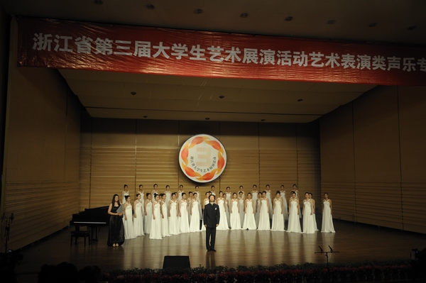 悠悠西子湖畔,我院两支专业特色团队在经过几个月的排练之后,女声合唱团表演的《樱花》、《工尺谱游戏》和器乐合奏《龙腾虎跃》均获得浙江省大学生艺术展演乙组(专业组)一等奖。