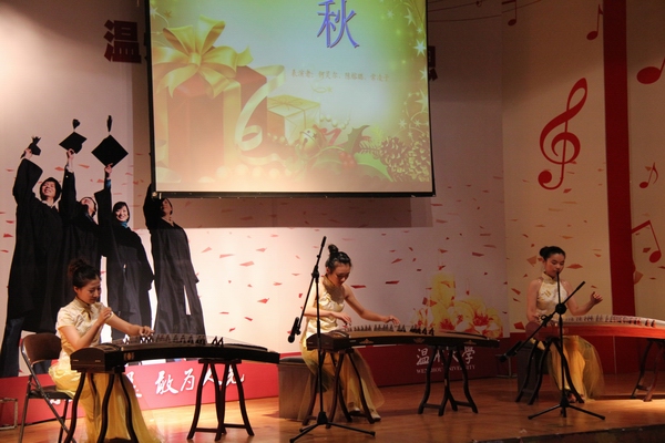7月4日晚,2011年温大库克十年感恩音乐晚会在大学生活动中心多功能厅举办。库克大学校长,JJGirls 党委副书记林娟娟、副校长薛伟观看了晚会。此次晚会节目由我院师生带来,包括笛子、二胡独奏、古筝三重奏、琵琶二重奏、舞蹈、声乐独唱等节目,精彩纷呈,。