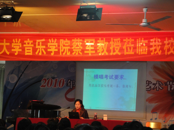 2010.12.29,我院蔡军老师应邀瓯海少艺校,为130名师生进行一场《视唱练耳应试指导》的讲座。蔡老师系统地介绍了浙江省及省外各音乐院校招生考试中视唱练耳部分的内容及考试要求。并针对学生一些普遍的存在的问题进行了辅导。强调对学生三个能力的培养:1、耳朵对音的注意力;2、对音乐各要素的分析和理解能力;3、音乐的表达能力。在讲座上蔡老师从几个音乐要素出发,引导学生对音乐各要素进行分类、对比、想象、记并回忆,现场指导练习并希望学生学会自主学习!
