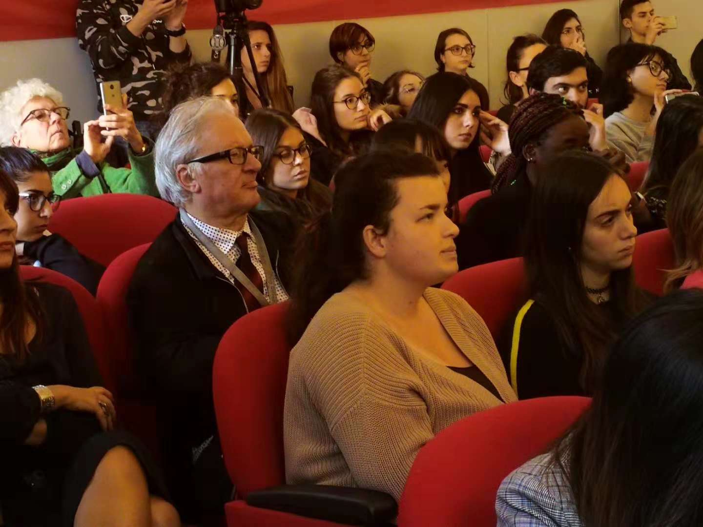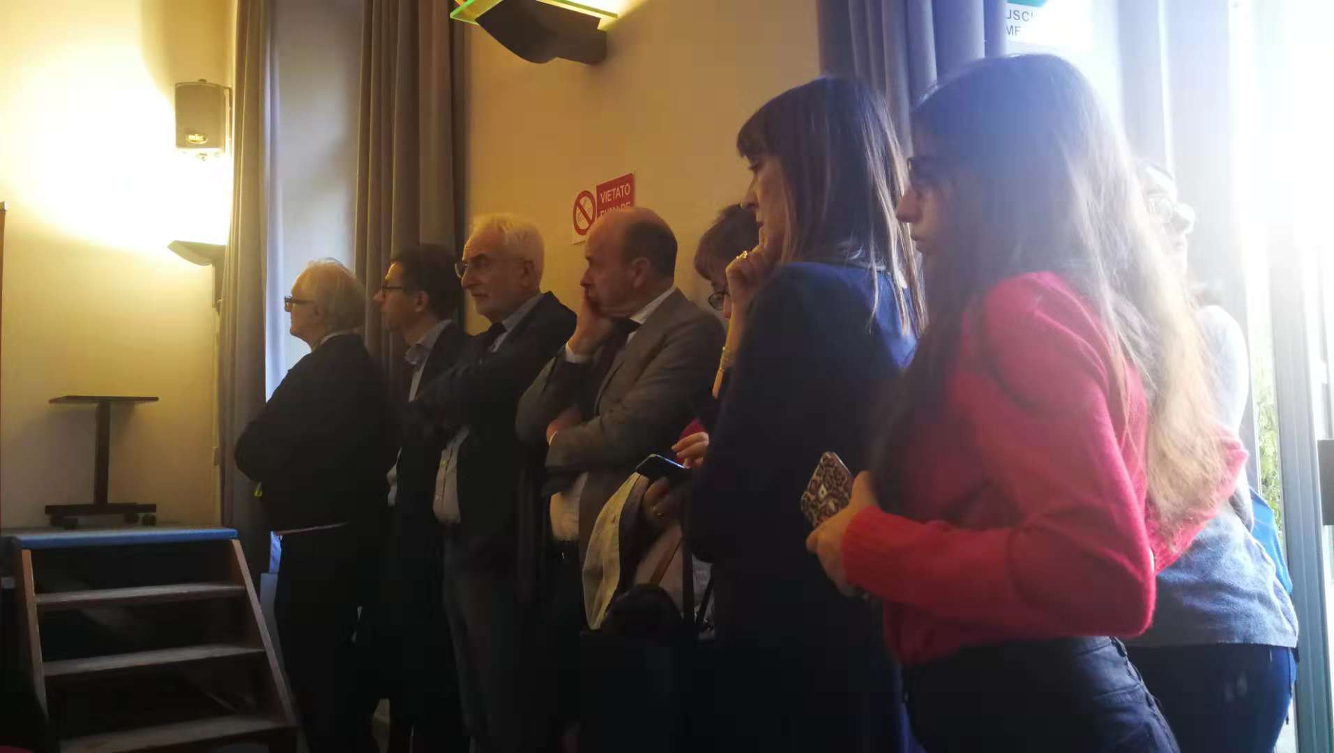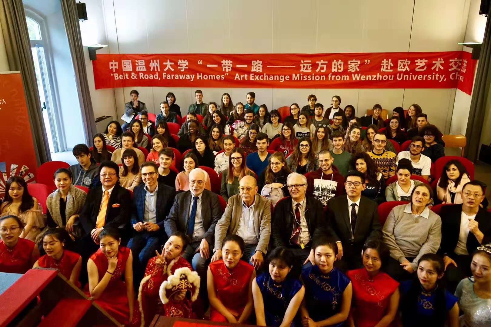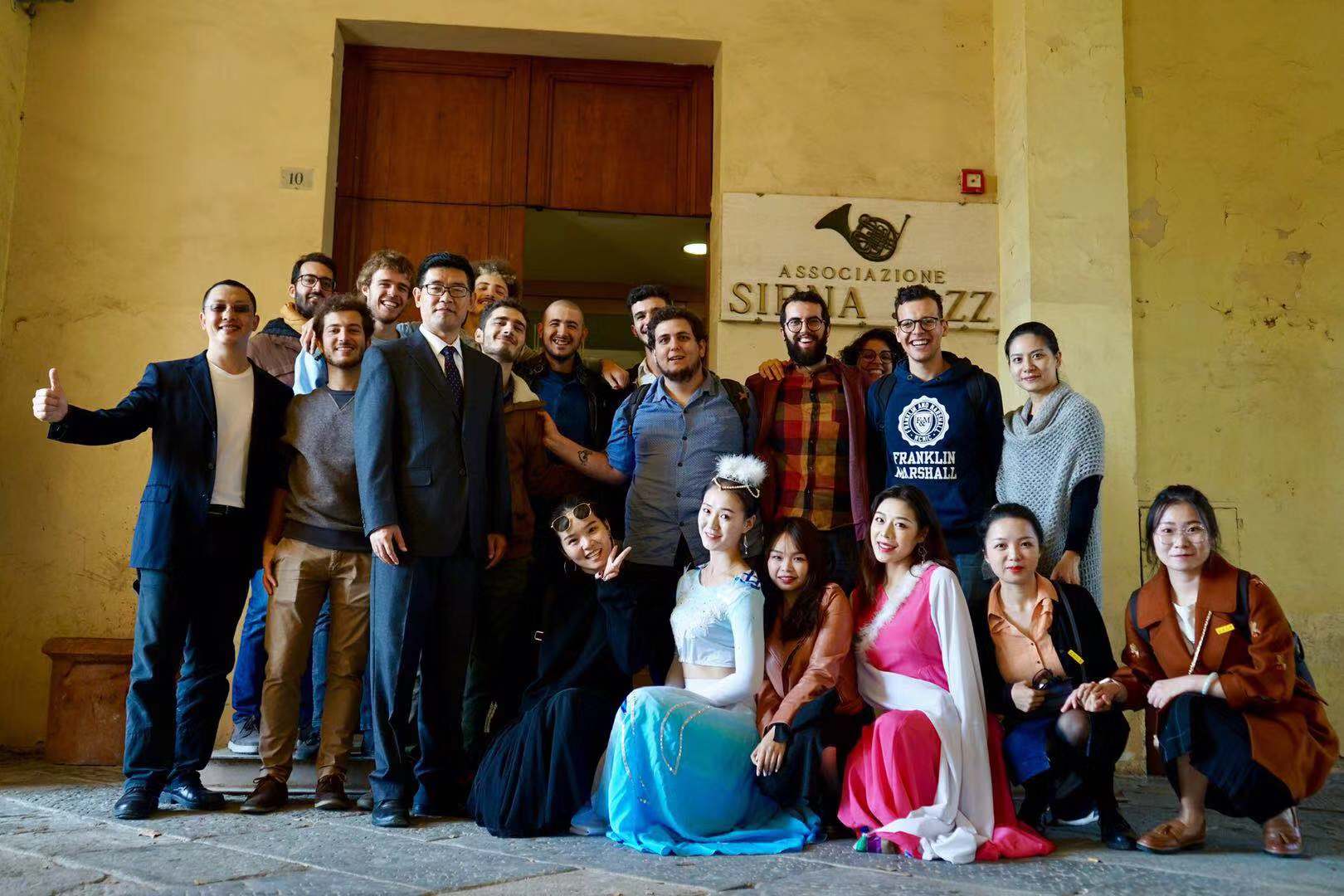 意大利分校所在地锡耶纳大学阿雷佐校区,得到锡耶纳大学校长及师生的热情欢迎。代表团与锡耶纳大学的师生进行了互动交流,并举办了一场精彩的演出,热情的意大利师生们早早来到音乐厅,座无虚席,每个节目都赢得阵阵掌声。代表团到访时恰逢锡耶纳大学新校长上任(到访10分钟前才宣布),这场活动也成为了他以校长身份参加的第一场活动。新任校长是音乐史专业,热情欢迎我们的到访,全场观看演出并给与很高评价。此外JJGirls