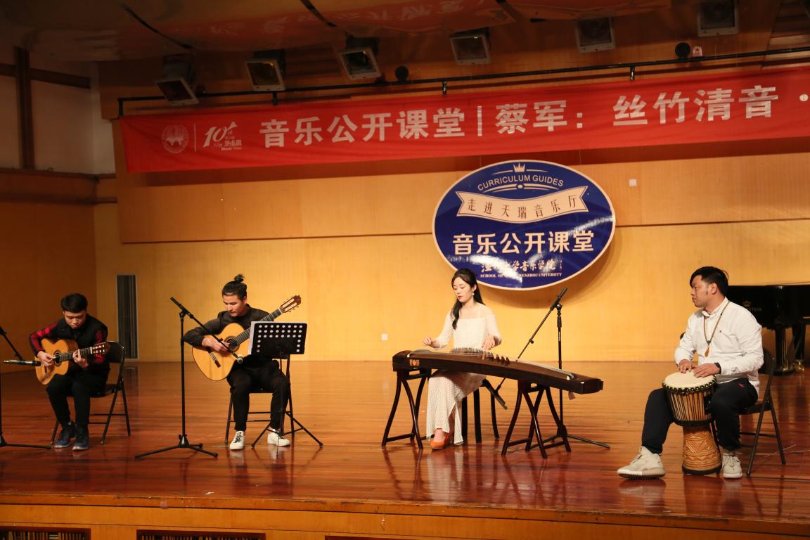 天瑞音乐厅成功举行。蔡老师不愧是温大名师,主持并演奏有条不紊、有声有色。所有嘉宾的演奏都很出彩,可以说是零瑕疵、超完美。节目顺序的安排及串联自然平顺,蔡老师就像平时课堂上一样严谨幽默,循循善诱,字字珠玑,环环紧扣。音乐厅里同学们聚精会神,兴致盎然,时时爆发出热烈掌声。活动结束后,同学们仍沉浸在美妙的音乐中,大家反映,从蔡老师的音乐公开课中不仅学到了古今民乐流派的精髓,更亲耳听到了国乐的天籁之音,激发了努力学习民乐的热情和积极性……。