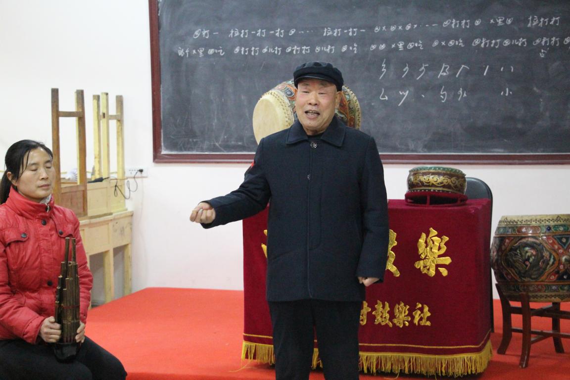 在演奏开始之前由国家级传承人田中禾老先生为我们讲解集贤西村鼓乐社的历史,田老先生讲:“集贤鼓乐属于唐代宫廷音乐,据师傅张有明口传,集贤这个地方的历史相当悠久。早在秦代的时候,渭水南边,现在终南往东这里建有朝阳宫,到了西汉武帝的时候就在集贤的东北角建有皇家戏楼,大唐初期唐高祖李渊下旨给尉迟敬德建造‘圣寿宫’,武德六年,以集贤南北走向一条小河为界,把集贤化为东瀛和西社,东瀛是皇帝的行宫,西社为百姓聚居地。因终南山一带风景秀丽,皇族常来此游玩、狩猎。唐玄宗时号召与民同乐,西社很多青年人进入圣寿宫学习音乐。‘皇家梨园’队伍不断扩大,两大乐师李姓和王姓立足圣寿宫,把宫廷音乐传授给弟子,此时乐曲达到两千多首是最鼎盛的时期,到第45代传人张有明是仅仅只剩124首乐曲。对我们后人来讲,是传承文化的重任,我们乐社从我开始自99年培养了五六批社员,我认为鼓乐最重要的是鼓和韵曲,缺一不可。