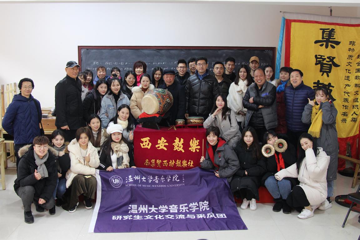 2018年12月5日上午,我院研究生在院长赵玉卿教授、硕士生导师冯百跃教授、刘玉亭副教授、叶文辉副教授、科研秘书周斌老师的带领下,赴周至南集贤西村鼓乐社传习所采风。周至南集贤西村鼓乐社是目前西安鼓乐六大百年乐社其中之一,属于俗派风格的农村乐社。