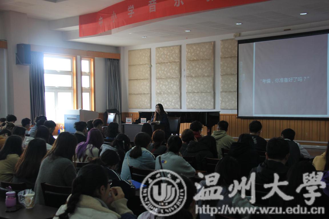 3月26日上午,由温州市道尔顿小学李咏雪老师主讲的音乐名师课堂《分条析理 娓娓道来—音乐学科面试策略解析》在音乐楼201报告厅举行。教学副院长王文韬、实习指导老师李葳以及教学科相关人员出席了讲座,卓越师资培育中心主任吴春艳主持、16级、17级、18级全体学生参与学习。