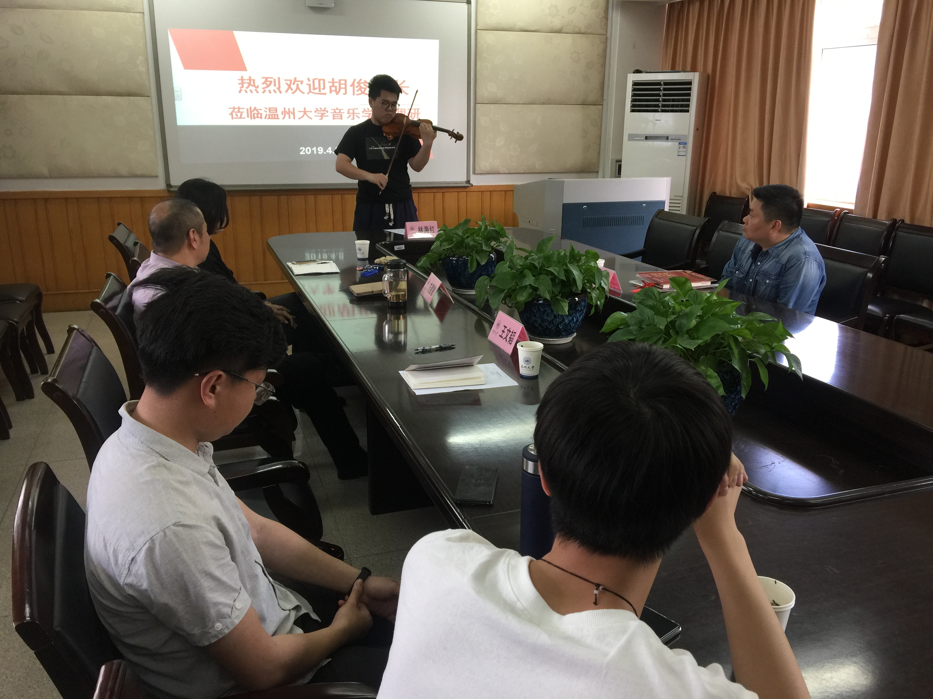 林海红老师就2019年学生暑期社会实践等工作,与胡馆长进行了交流,初定由王文韬老师带领一支实践队,于暑期入驻瓯海区文化馆开展第一期艺术实践活动。座谈会上,18级的姜浩文、程璐、周磊、孙心昊等4位同学现场展示了各自的才艺。