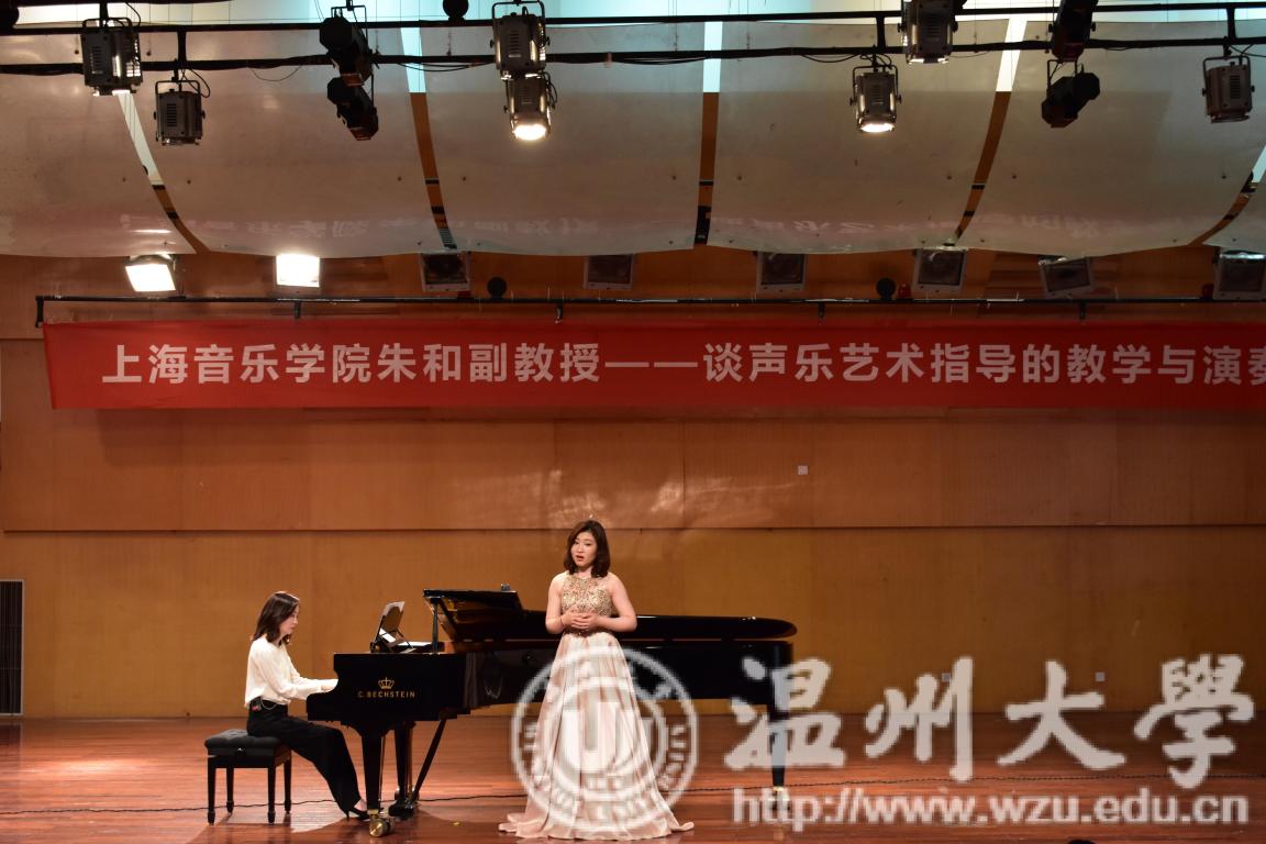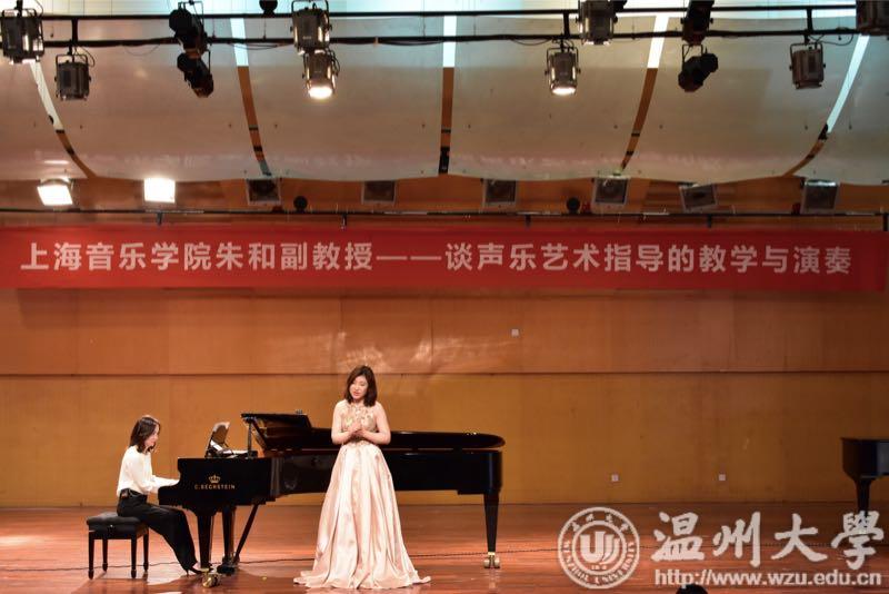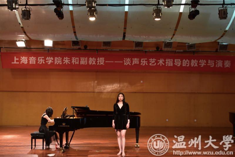 的感谢,来到学院后能深刻感受到每位同学的热情以及对音乐的热爱。朱和老师先通过对自己工作的简单描述引出了声乐艺术指导的概念,着重强调了对作品的理解、语言的正音和对音乐风格的整体把握。随后,朱和老师邀请嘉宾邱硕同学进行声乐演唱。一曲过后,朱和老师先对钢伴提出要求,要求钢琴伴奏者在拿曲目后必须认真分析作品内容,情感以及曲目结构。 最后,讲座在朱和副教授的示范教学和演奏中完美落下帷幕。