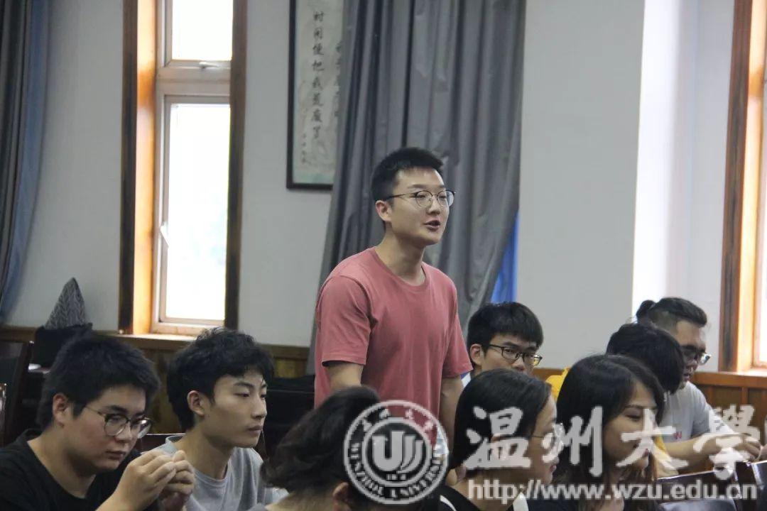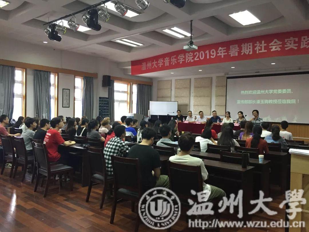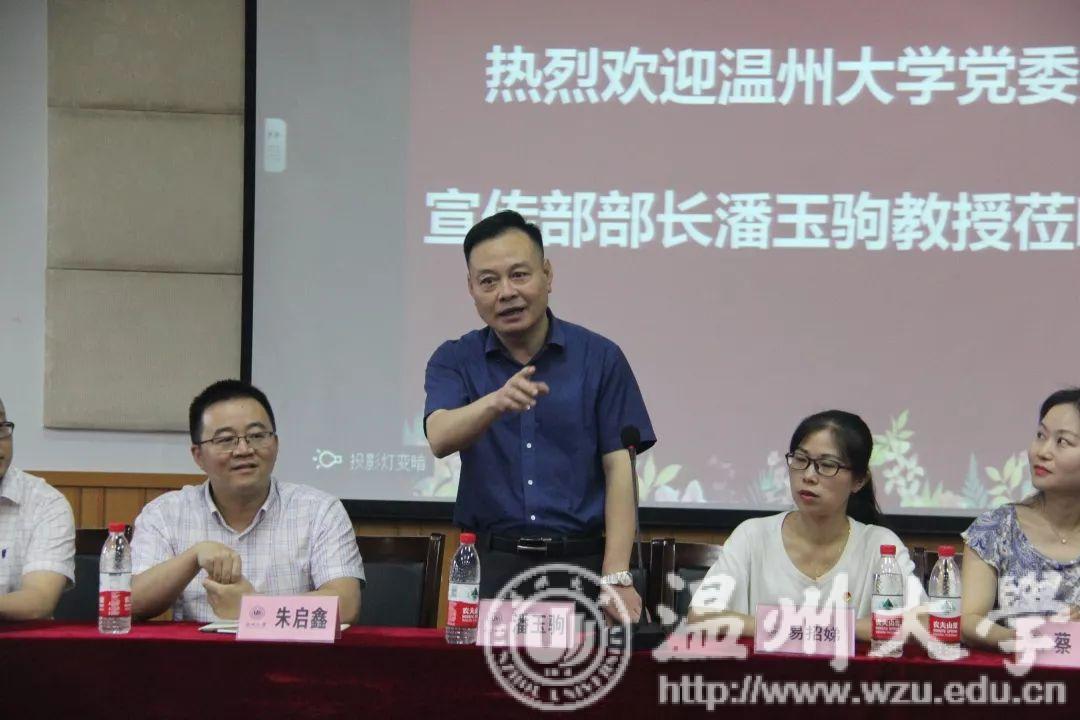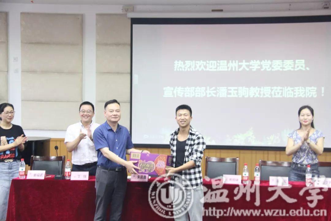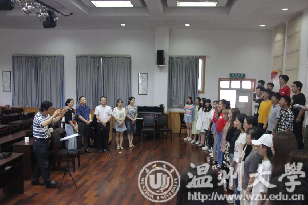在音乐楼,潘玉驹部长观看了合唱团的排练情况,并聆听了合唱团指导老师叶文辉教授对排练情况的汇报以及合唱团学生代表王熙文、魏亦欣的发言。听完师生的发言后,潘部长表示听到合唱团成员们优美动人旋律,看到同学们满怀着自信,充满笑容的脸颊,心中倍感亲切,并对叶教授以及同学们的辛勤排练以及近几日的排练成果给予高度的肯定。潘部长讲话中对同学们提出了殷切的希望,希望同学们能够利用这40天的假期,克服困难,艰苦排练,互相帮助、关照、关注,唱出温大好声音,唱出温州好声音。还祝愿同学们能将带着原创的歌剧进京演出,送入各大高校进行展演。人生中能有多少个暑假,人生既繁长又短暂,希望这四十天能够让同学们留下美好的回忆。随后,潘玉驹部长为同学们赠送了暑期慰问品,希望大家能够在这四十天中有所成长有所收获,并表示一定确保同学们的后勤保障工作,无疑是给同学们送上了殷切温暖的又一关怀。