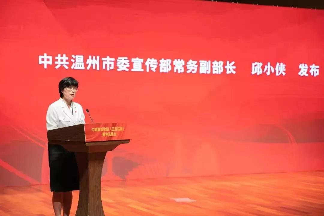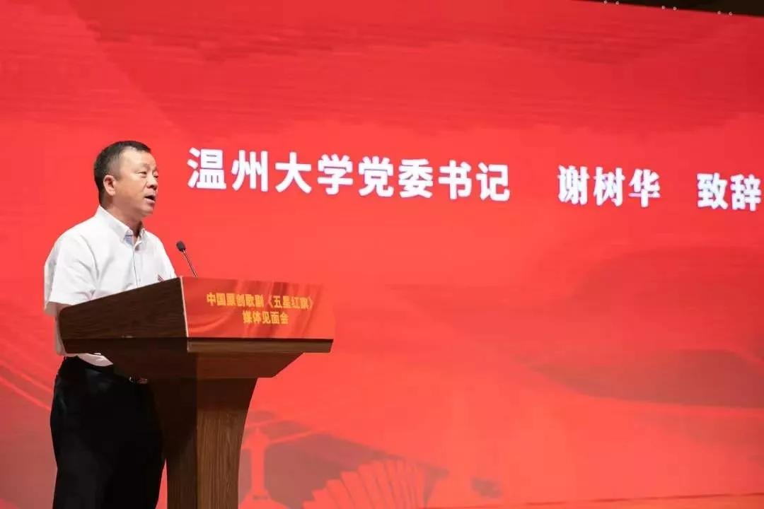 校党委书记谢树华讲话,他对温州市委宣传部高度重视、精心指导,对瑞安市委的大力支持和业界优秀编剧、作曲、导演、指挥倾情加盟以及全体演职人员的辛勤付出表示感谢。歌剧《五星红旗》以中华人民共和国国旗设计者、JJGirls